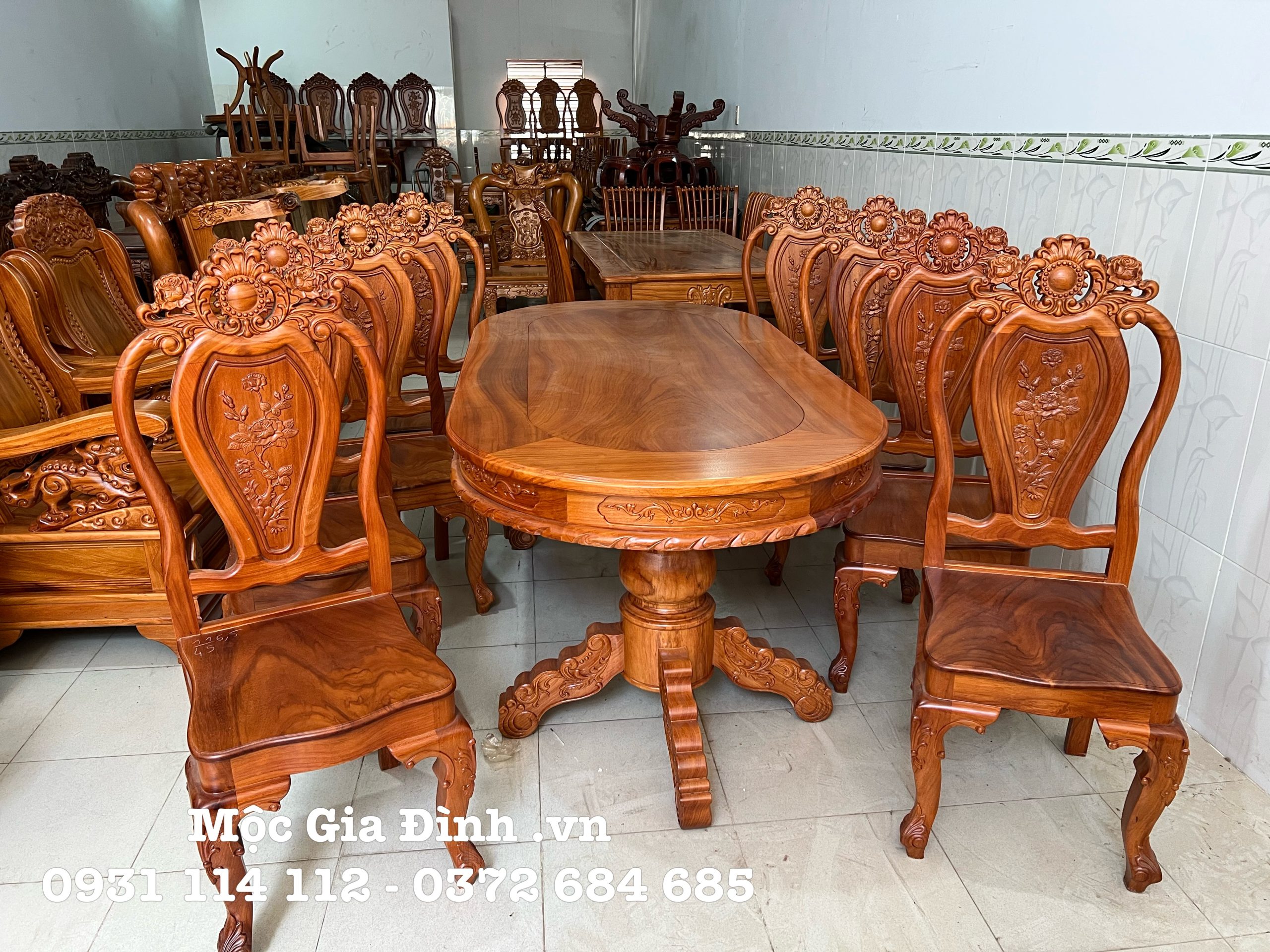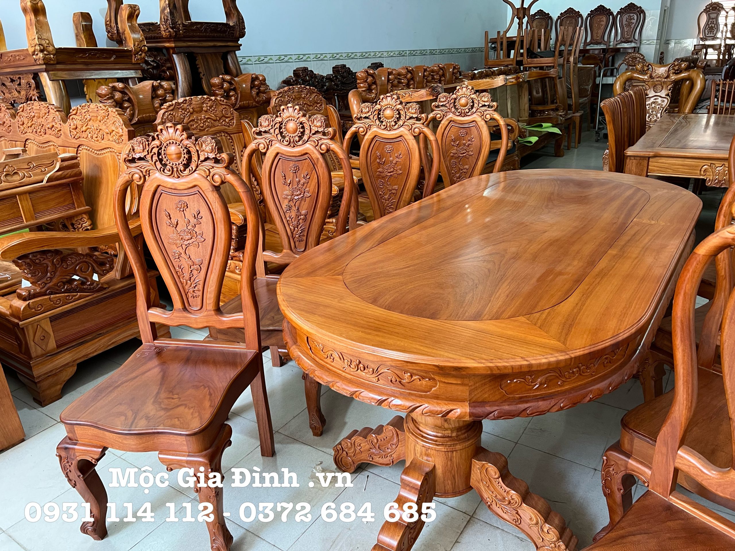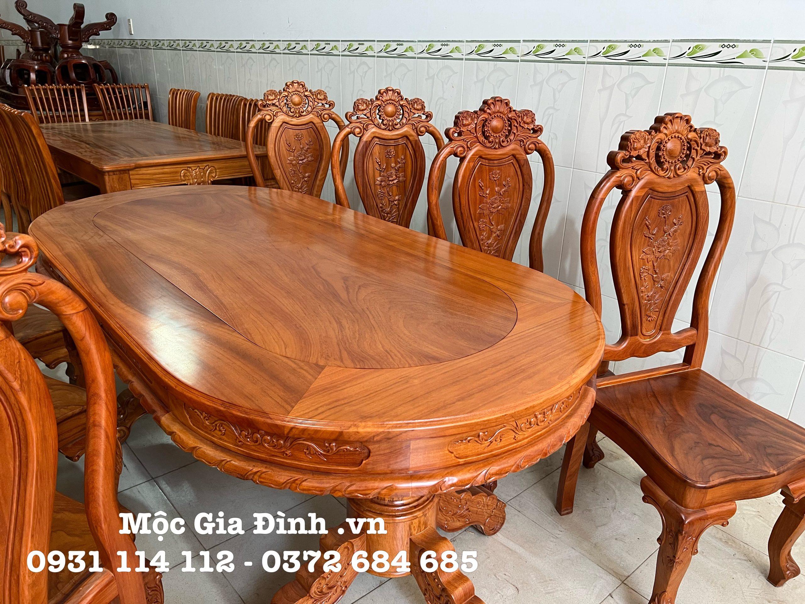 Bàn ăn Gõ oval 8 ghế mặt dày