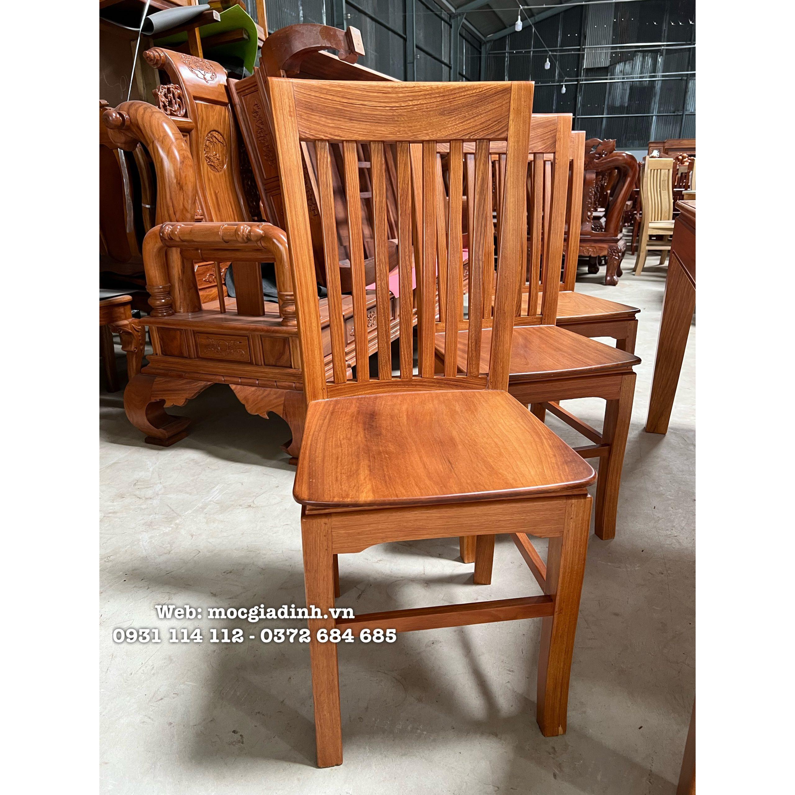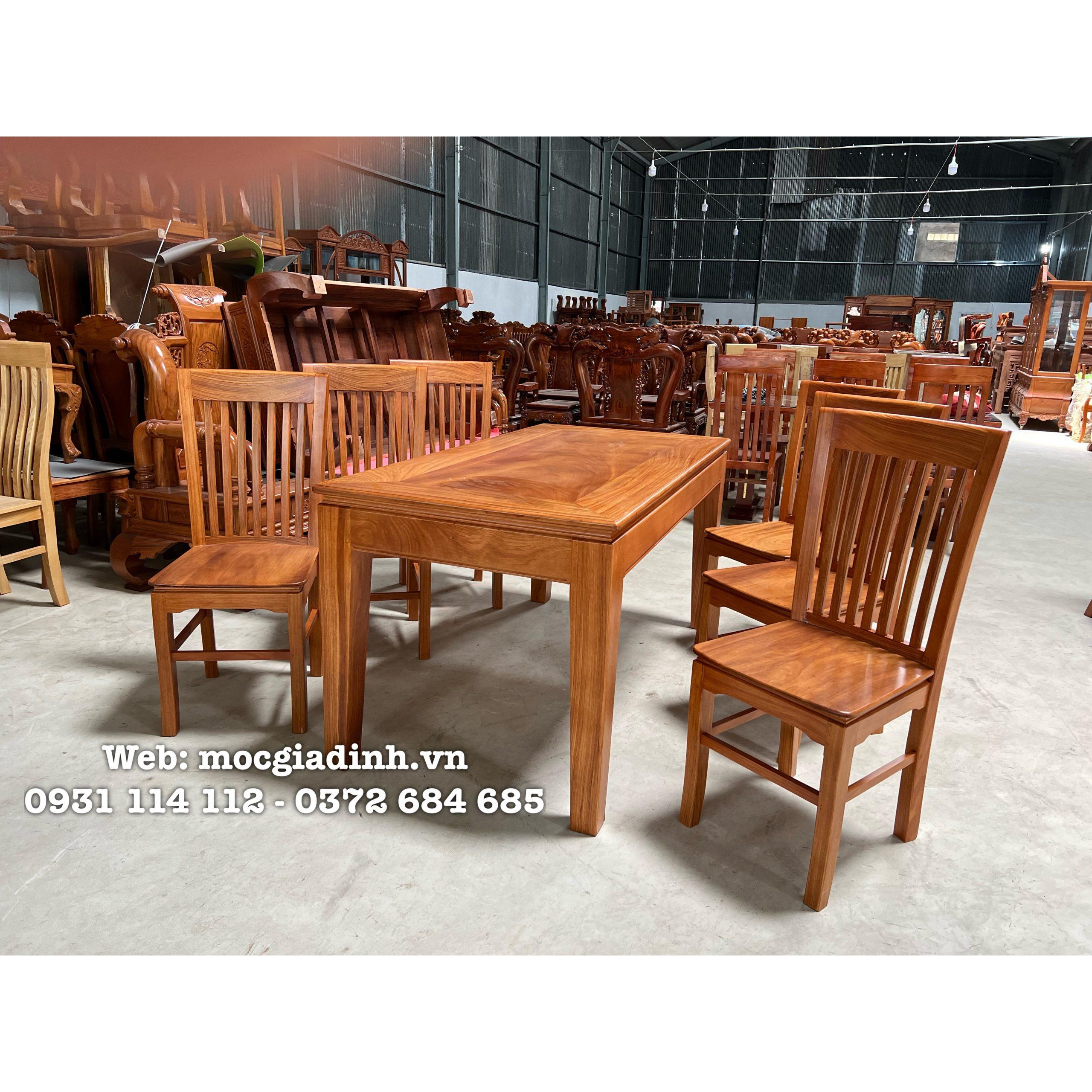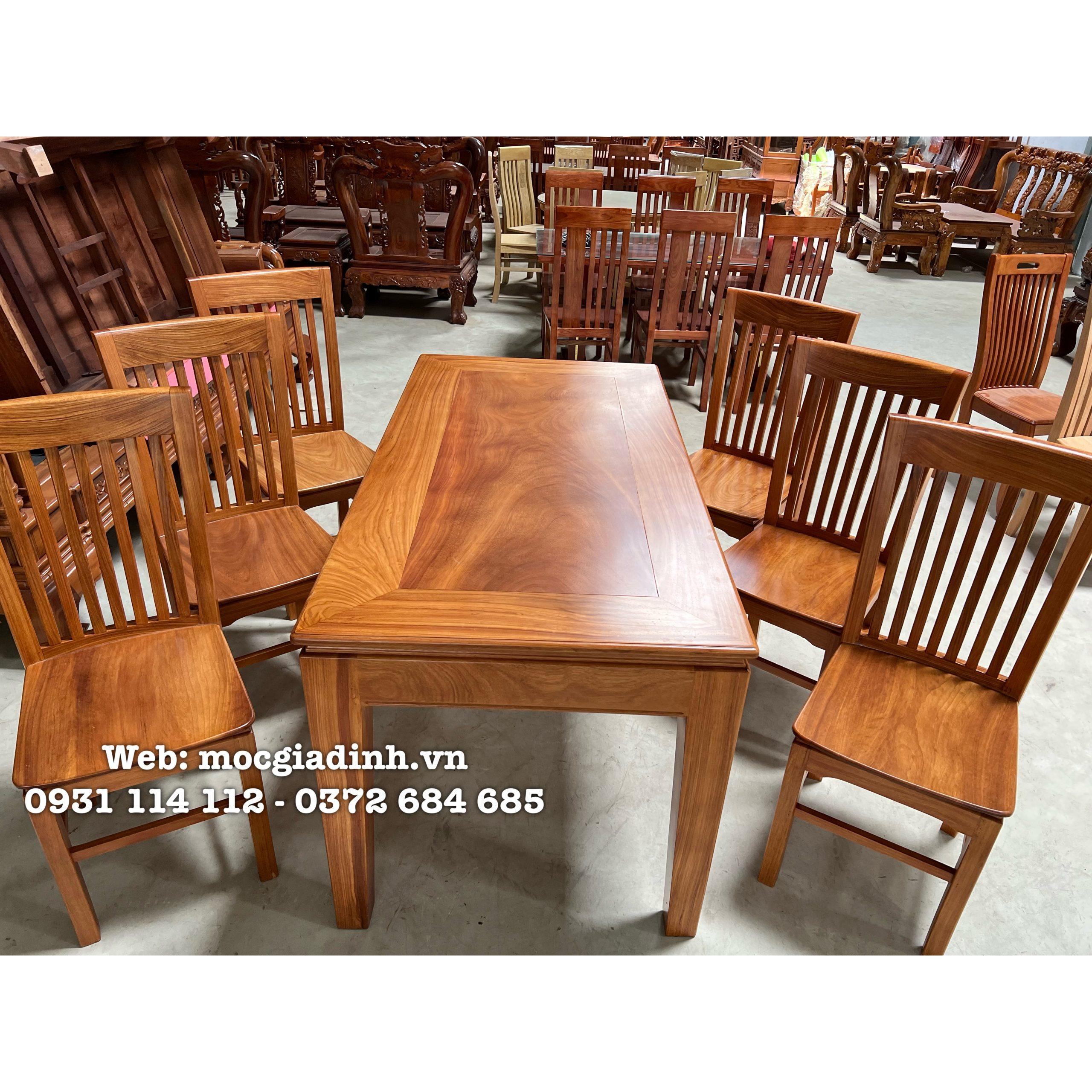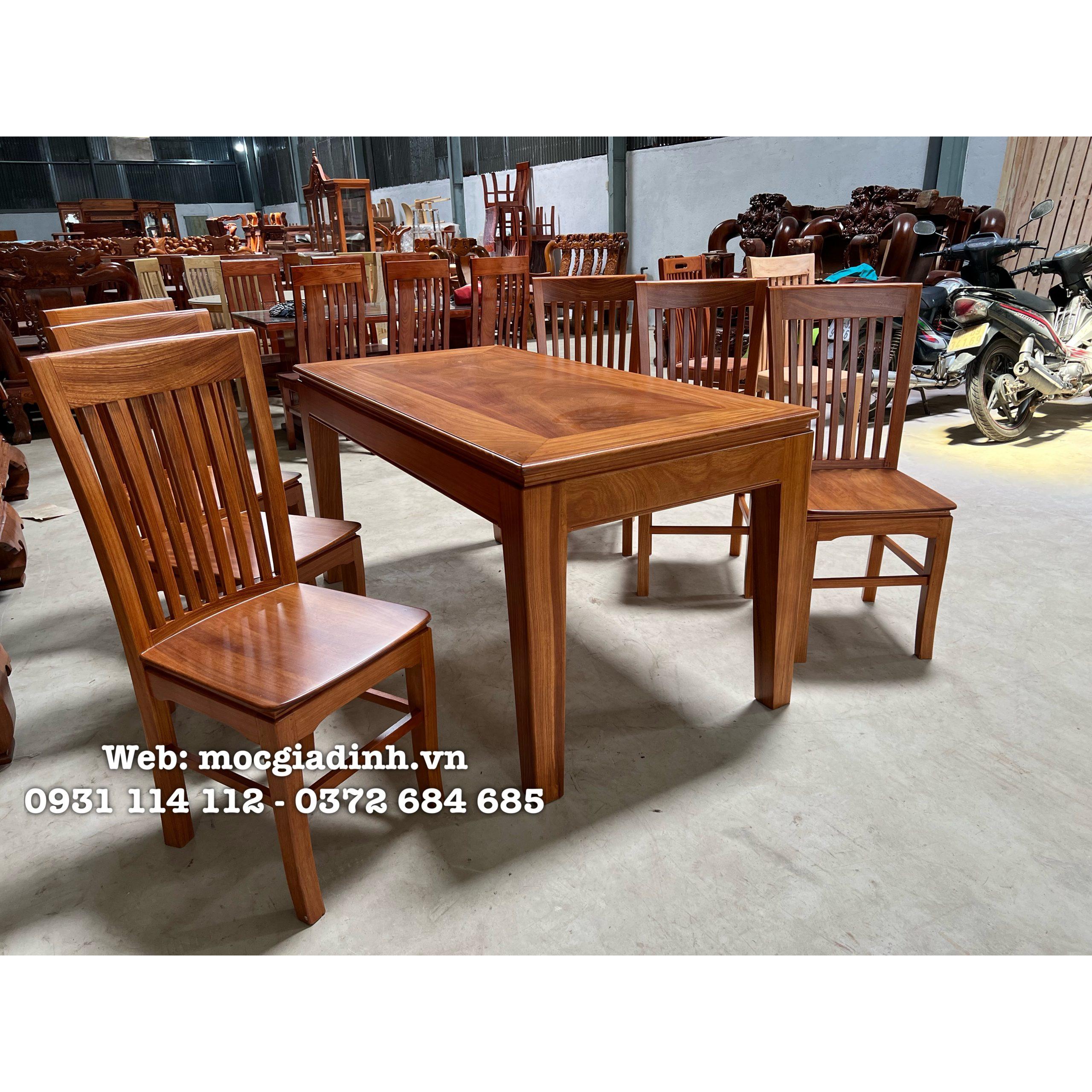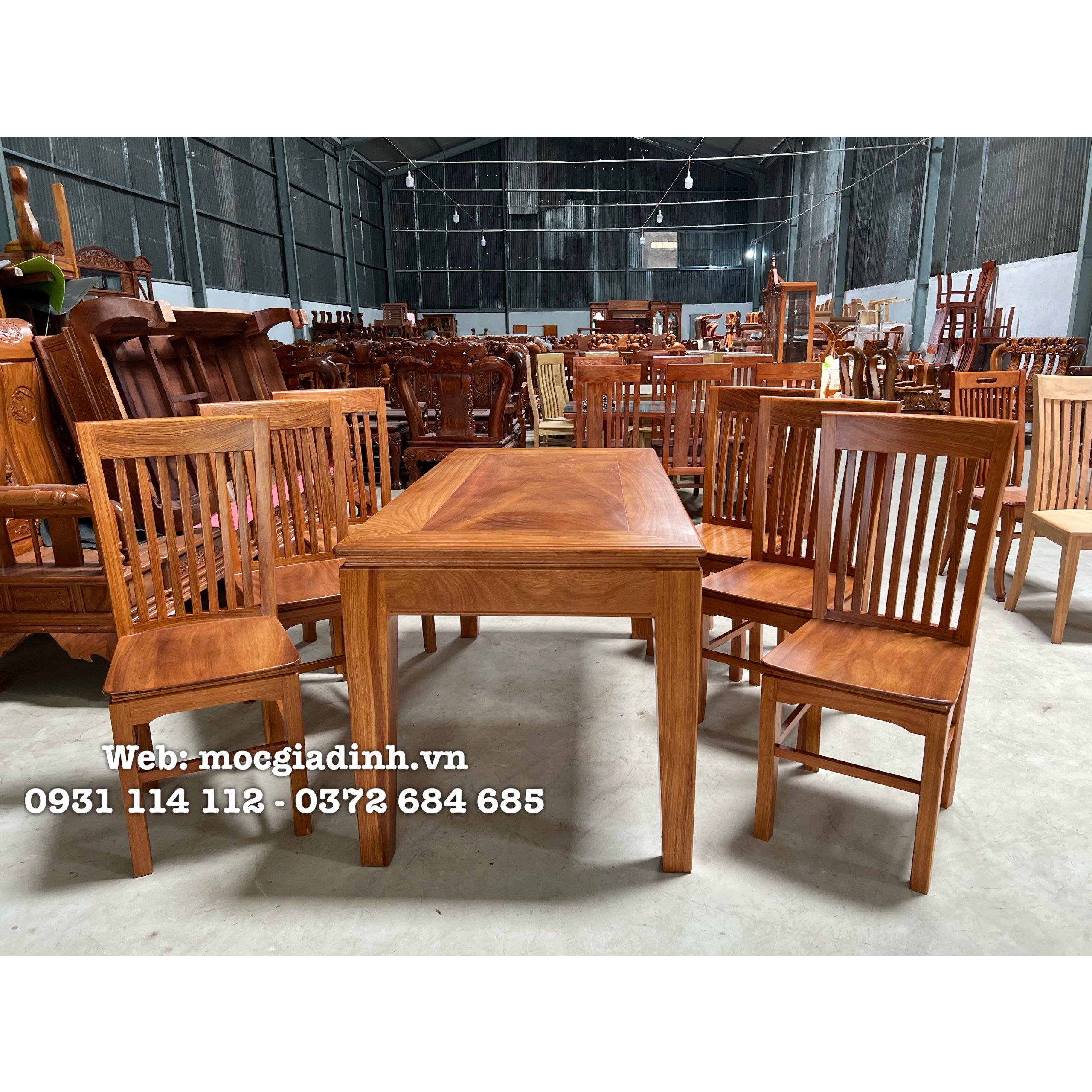Bàn ăn được làm bằng gỗ Gõ Đỏ toàn bộ thiết kế mặt chữ nhật chân vát tạo độ thanh mảnh cho bàn. Ghế bàn ăn được thiết kế kiểu hiện đại, tựa ghế bo cong ôm theo phần lưng tạo độ thoải mái cho người dùng.