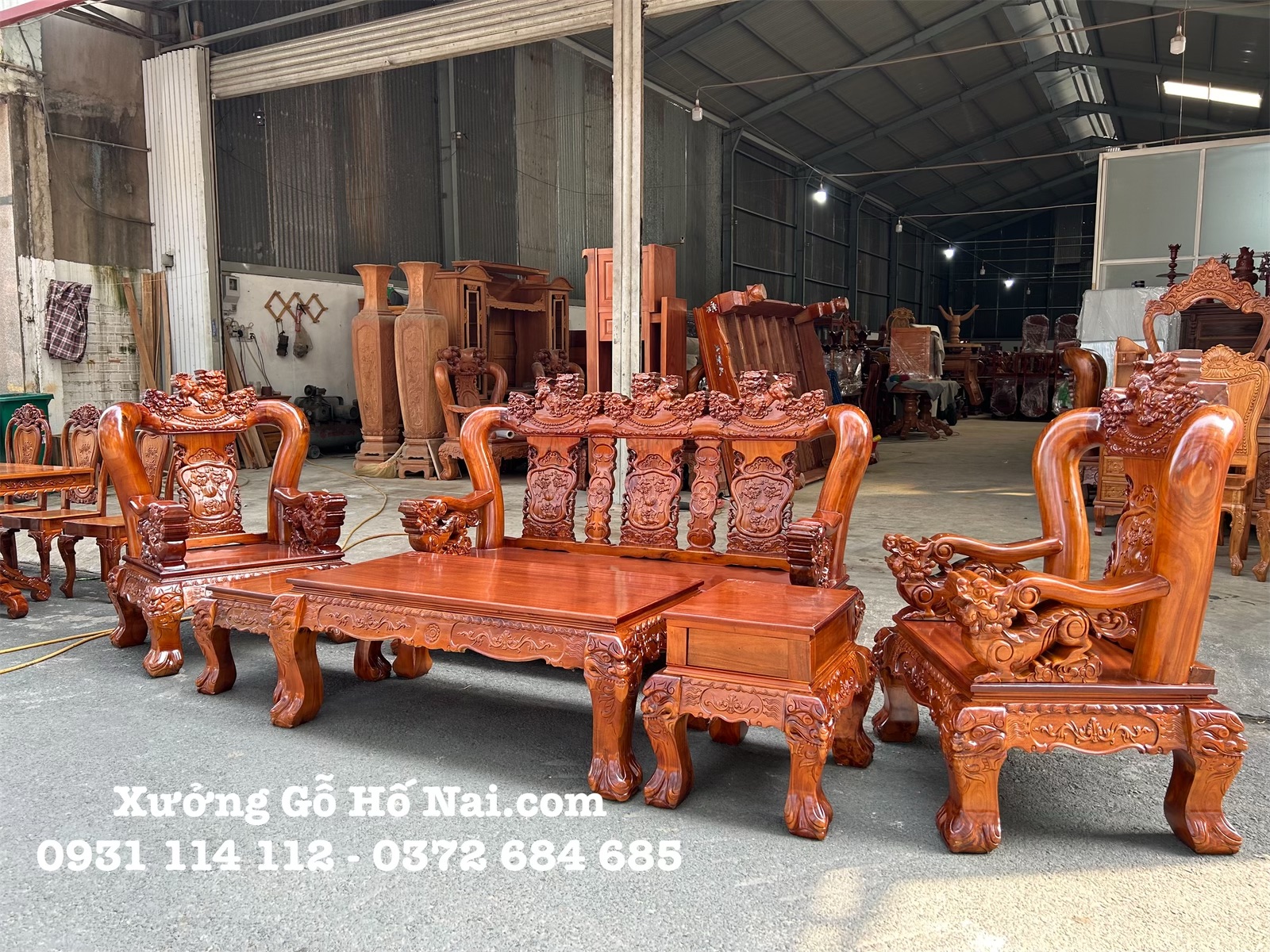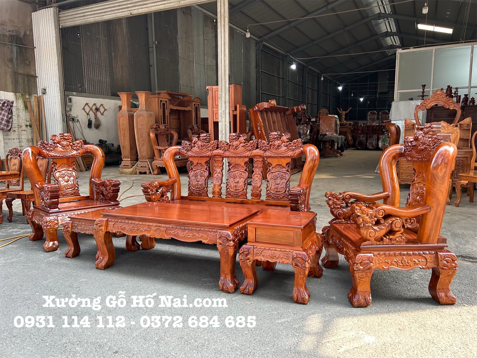 - Bộ bàn ghế phòng khách được làm bằng gỗ tràm rừng lõi có tuổi thọ từ 20 năm trở lên, mặt bàn- mặt ghế được làm bằng gỗ xoan đào dày 2,5cm nguyên tấm nguyên bản. Bộ bàn ghế làm tay trụ 14cm dưới tay cũng trạm kì lân nguyên con dày 12cm. Tựa ghế chạm tứ linh.