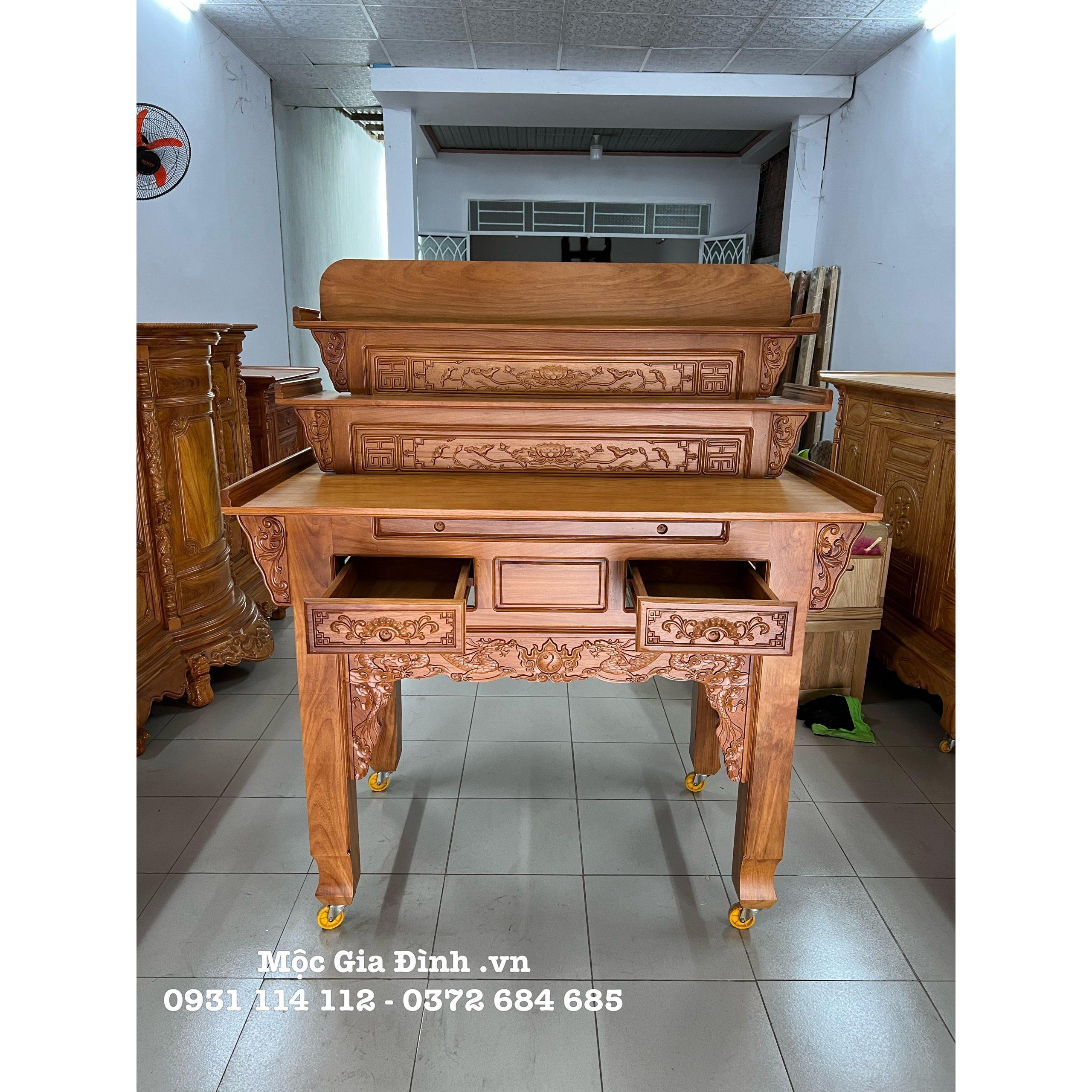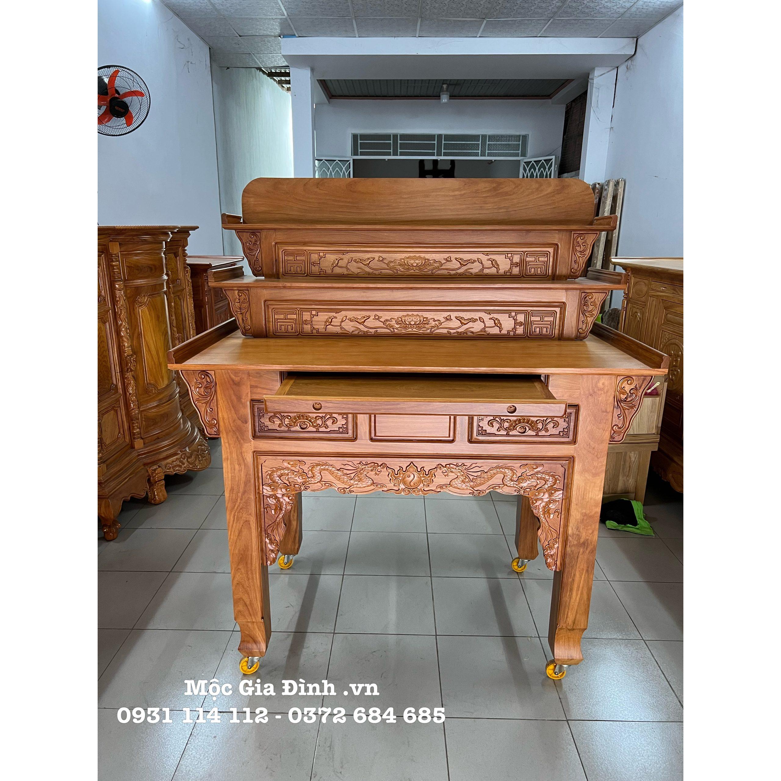 • Bàn Thờ Gia Tiên được làm bằng gỗ Gõ Đỏ 100%, bàn có 3 tầng để thờ nhiều cấp, dưới có thiết kế mâm cúng và hộc để nhang đèn. Mặt nguyên tấm dày 2.0cm chân trụ 10