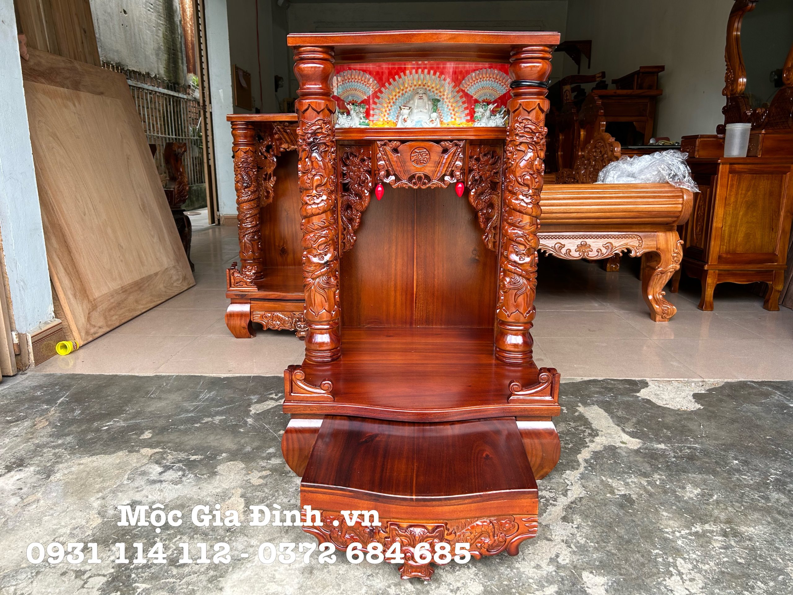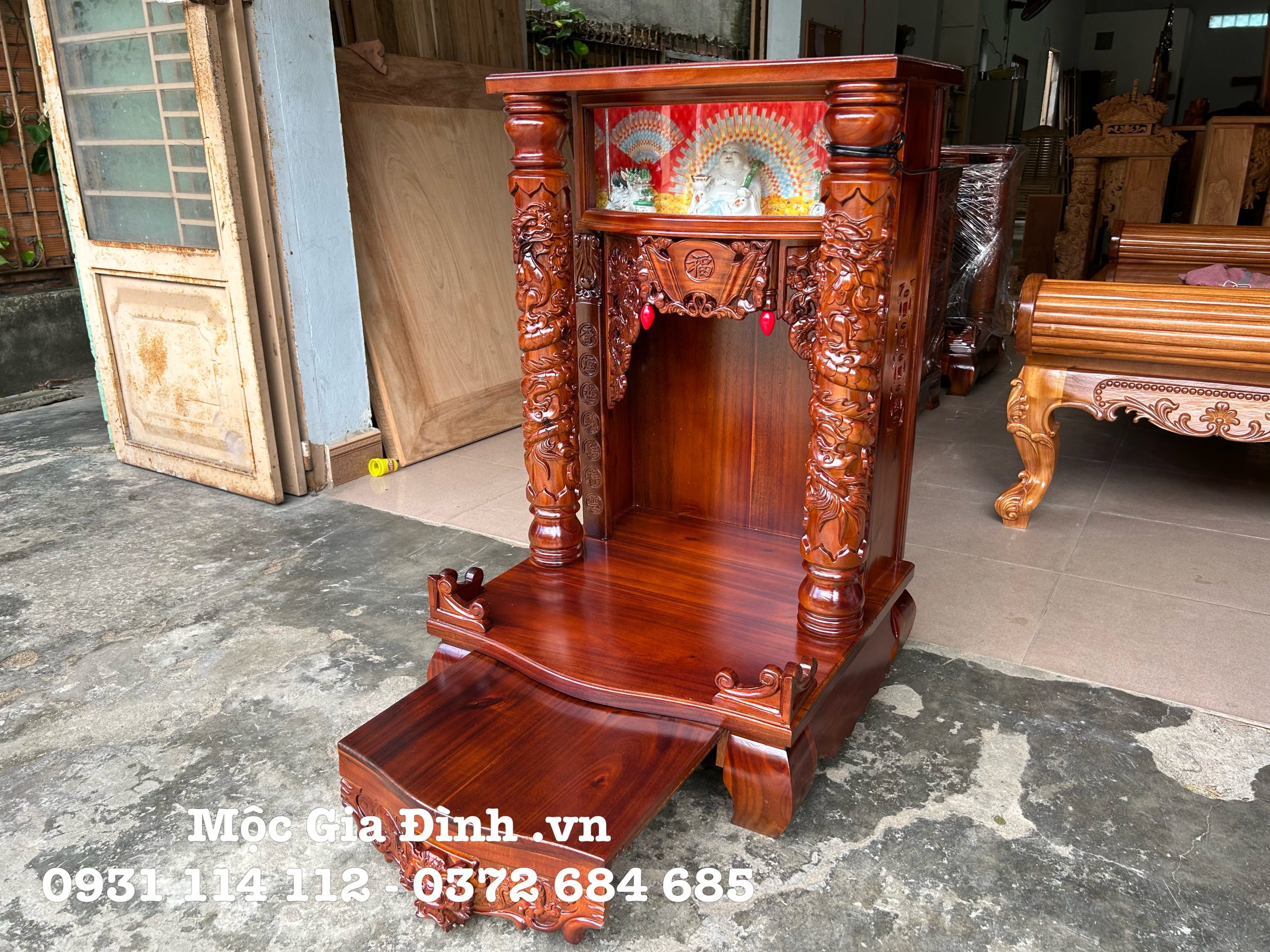 • Bàn thờ Thần Tài Gõ Đỏ Rồng Phun Nước 61*61*98 mặt 2cm