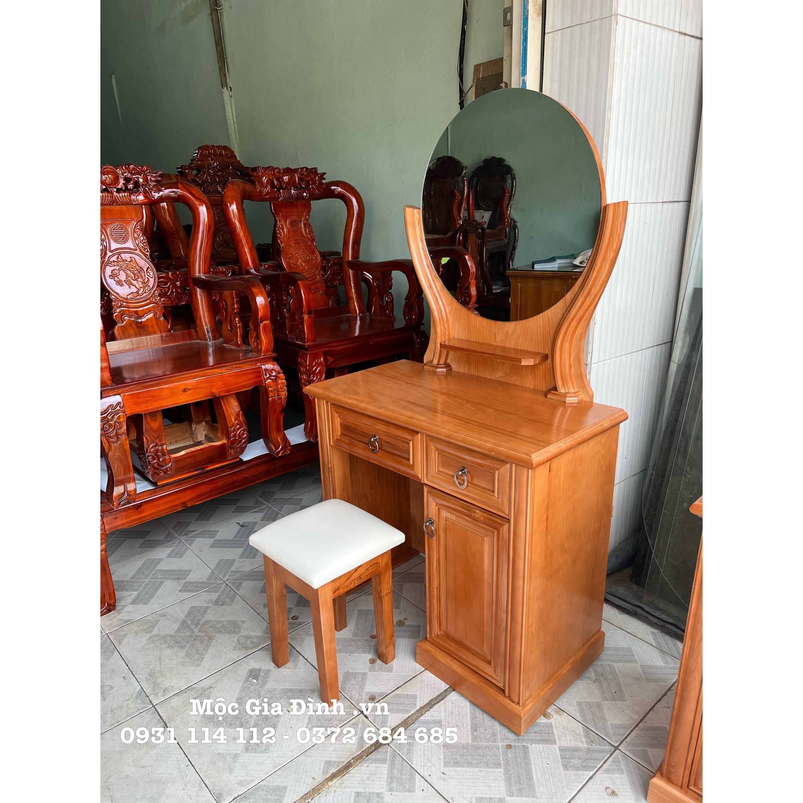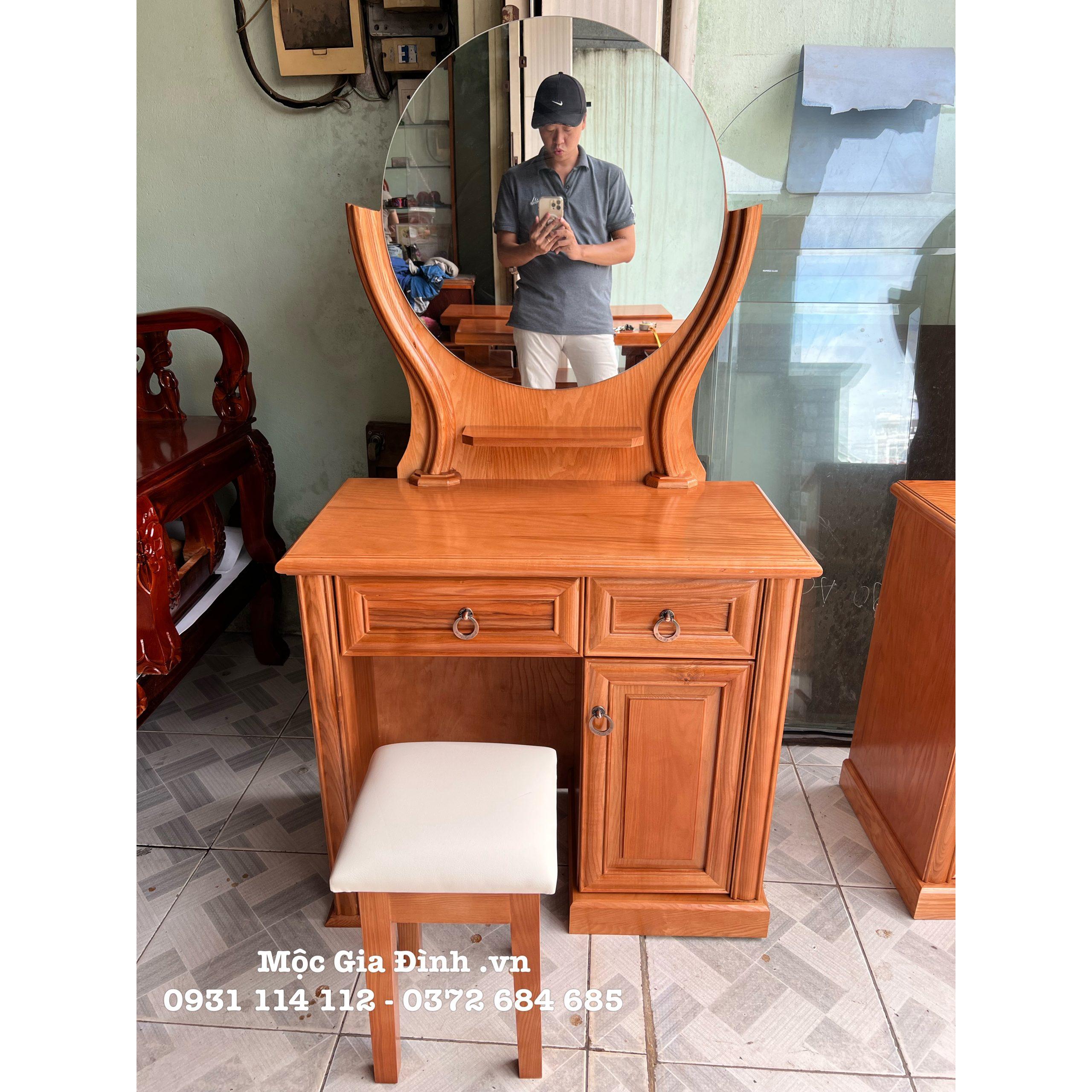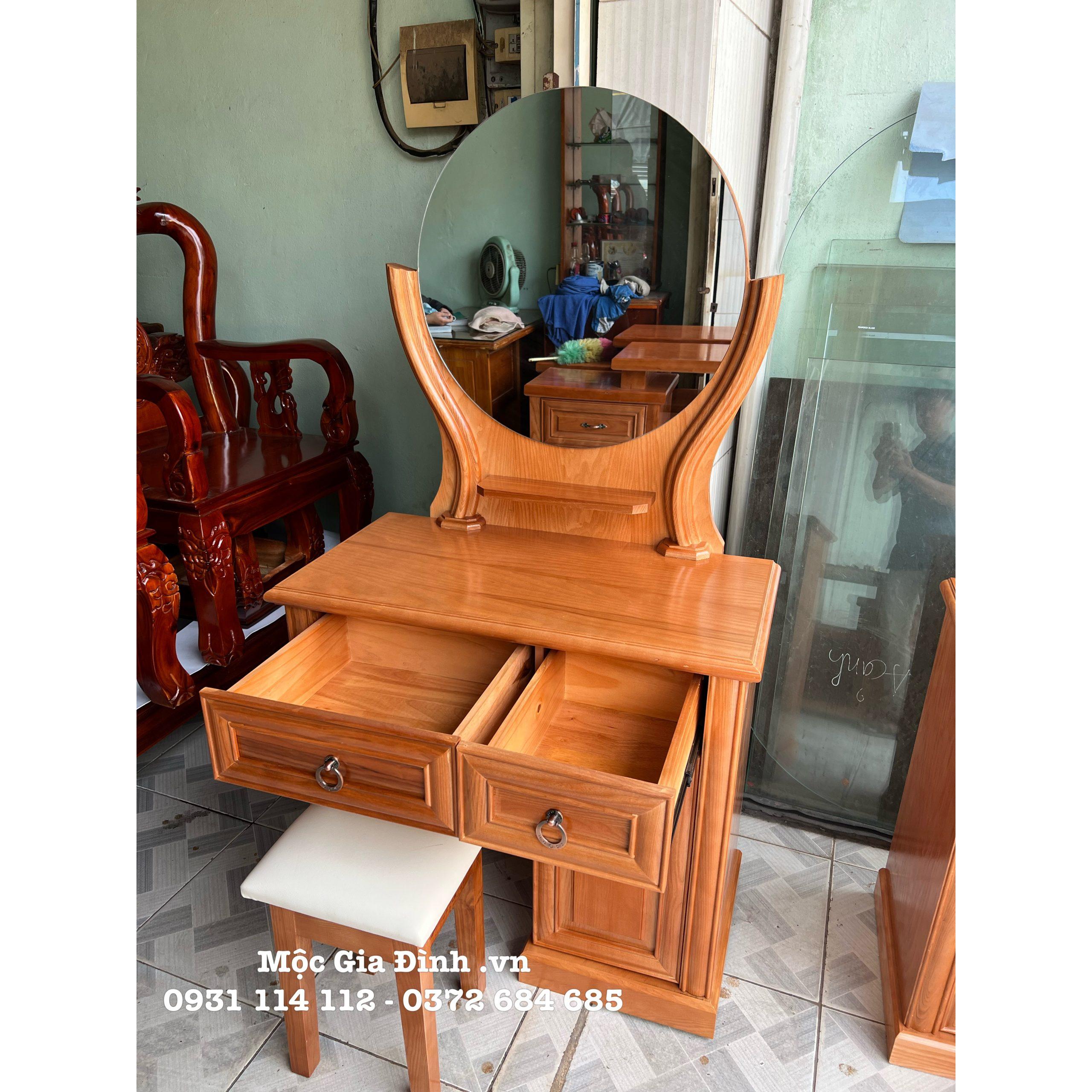 Bàn trang điểm được làm bằng gỗ Sồi Pháp sấy khô chống cong vênh mối mọt, hậu lưng bằng gỗ cao su ghép. Bàn được sơn màu giả gỗ xoan để có thể kết hợp nhiều nội thất phòng ngủ khác nhau, có thiết kế vuông và tròn
