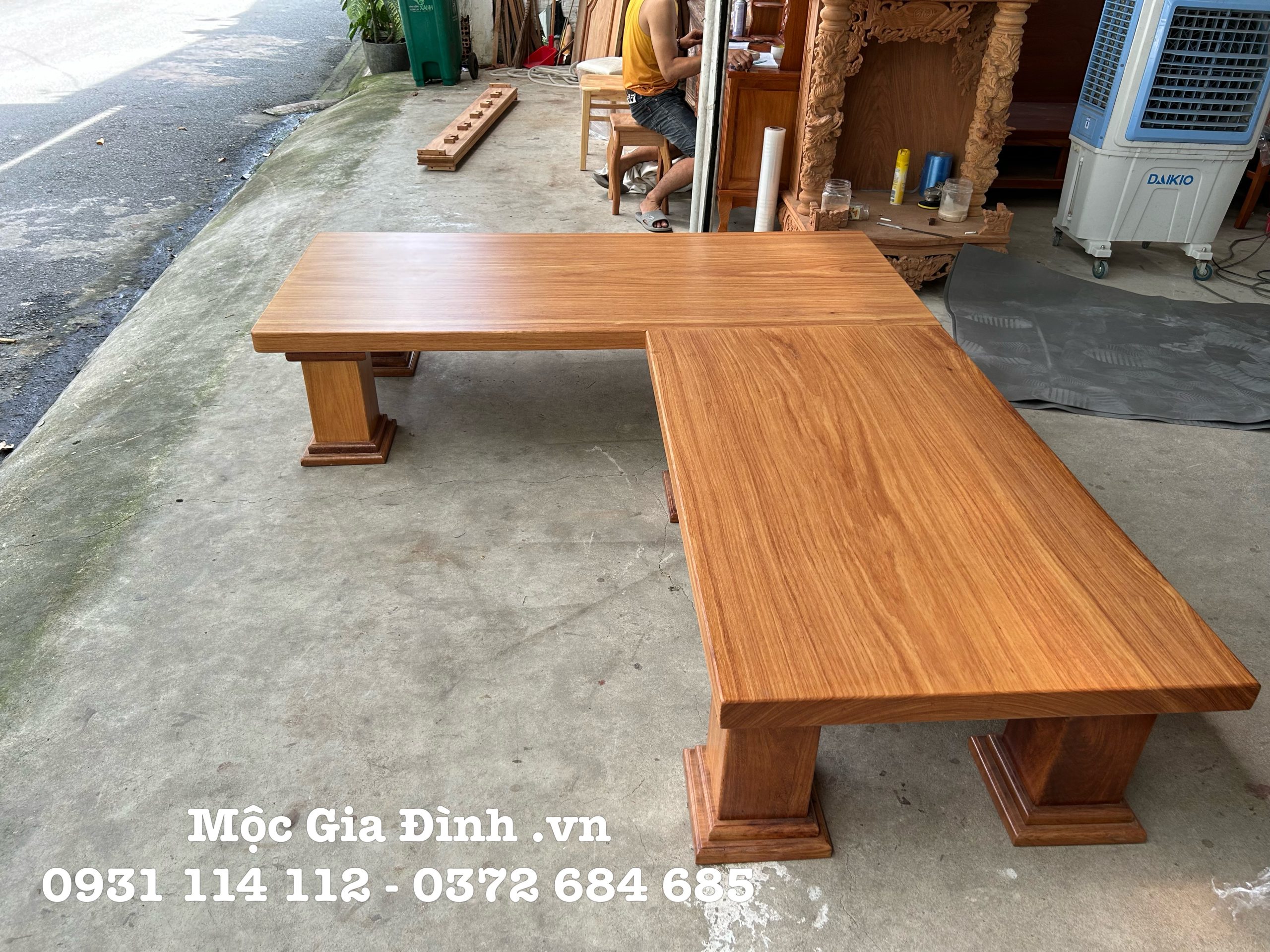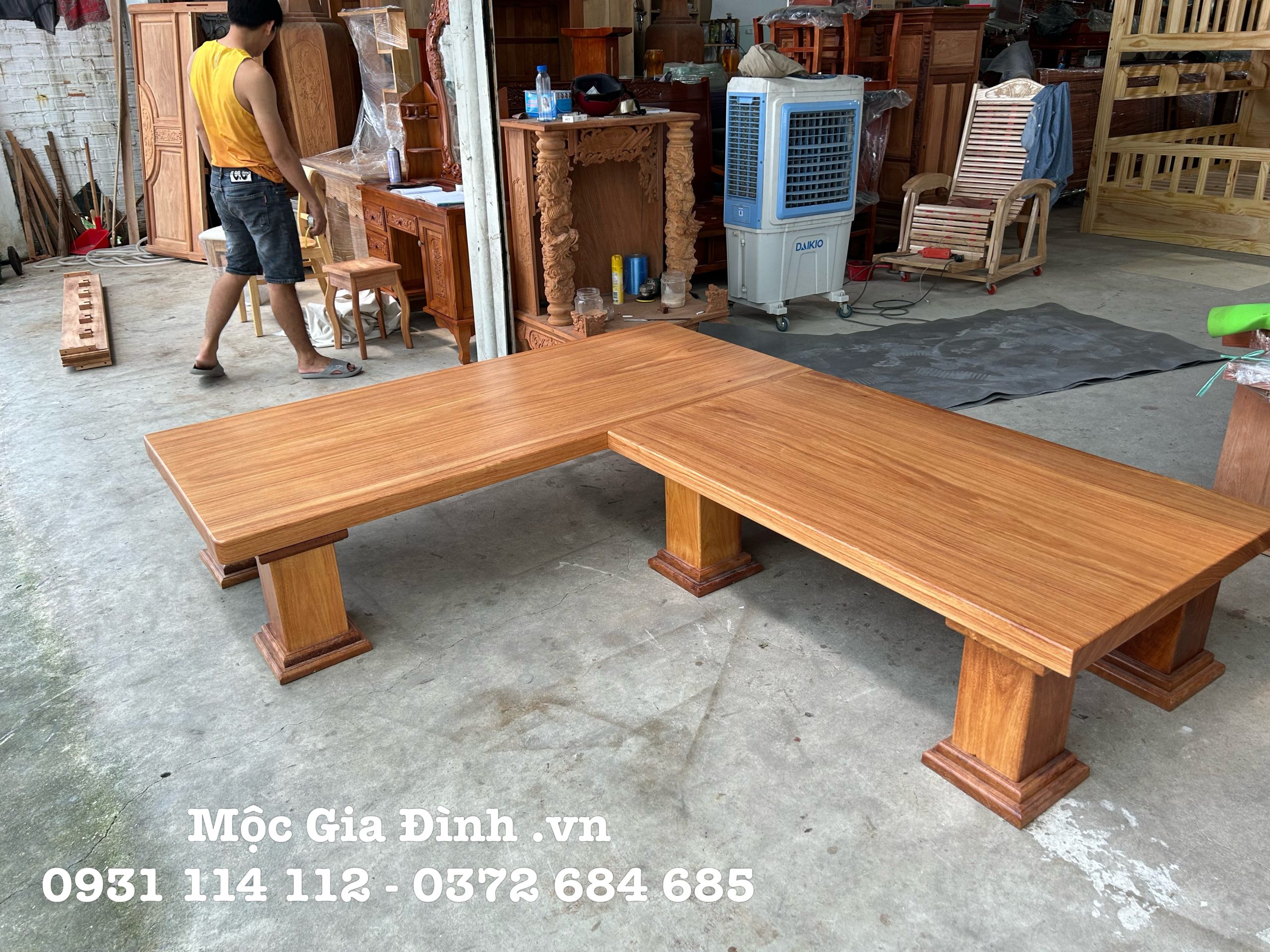 - Bộ góc được làm hoàn toàn từ gỗ Gõ Đỏ Nam Phi loại 1, với thiết kế đơn giản mặt nguyên khối dày 6cm, tạo không gian thoải mái vừa tiếp khách và có thể nằm nghỉ.