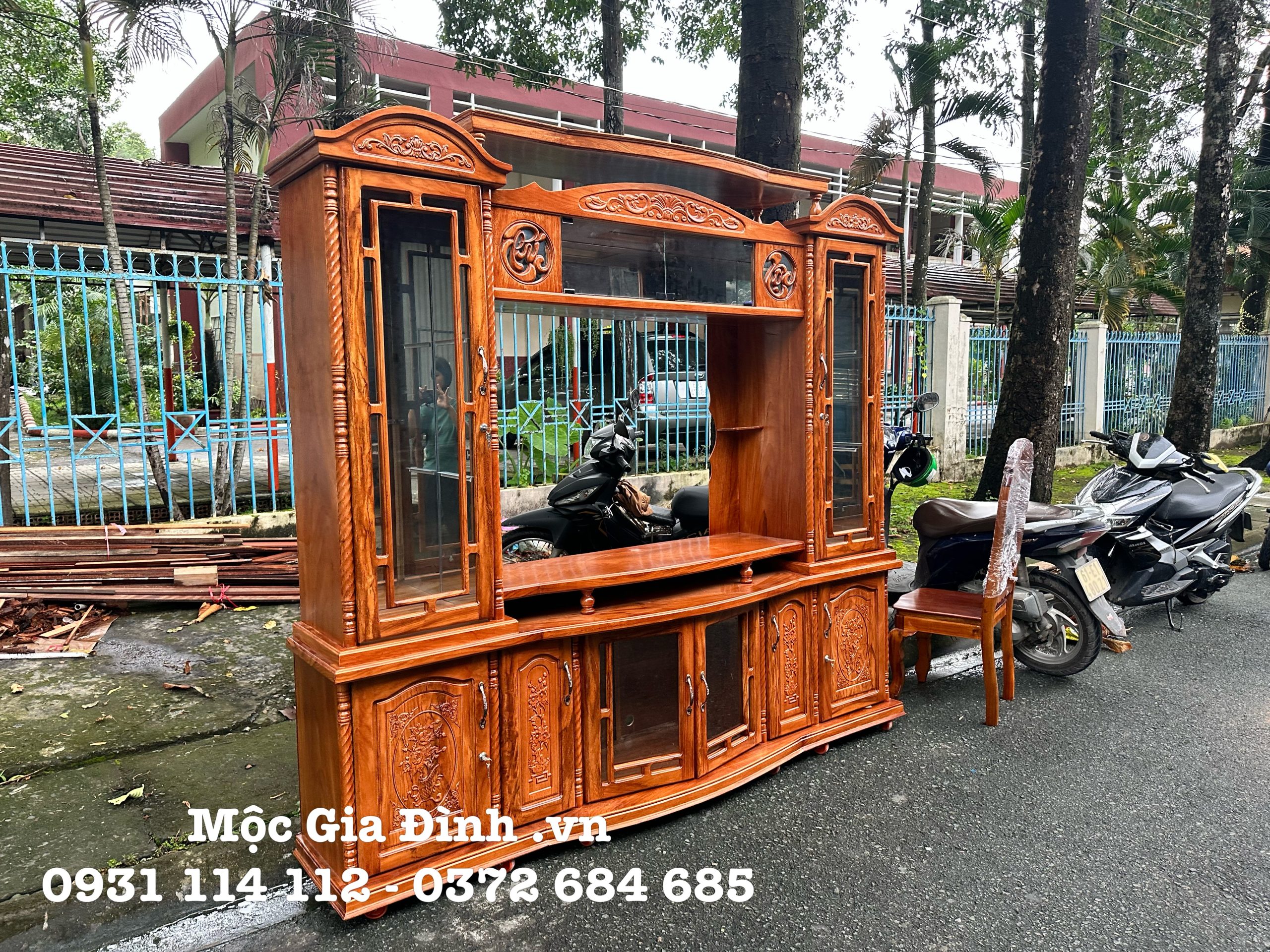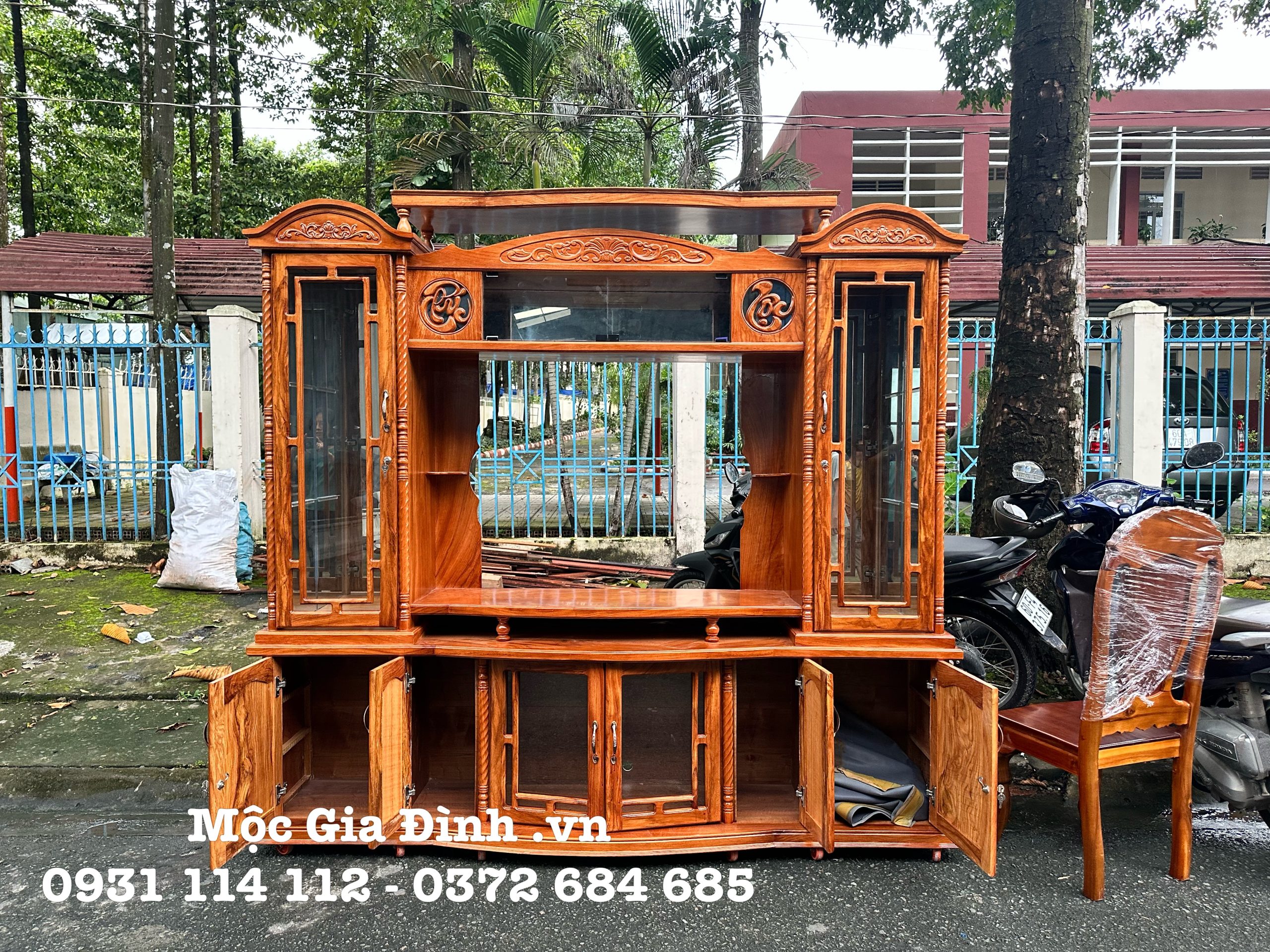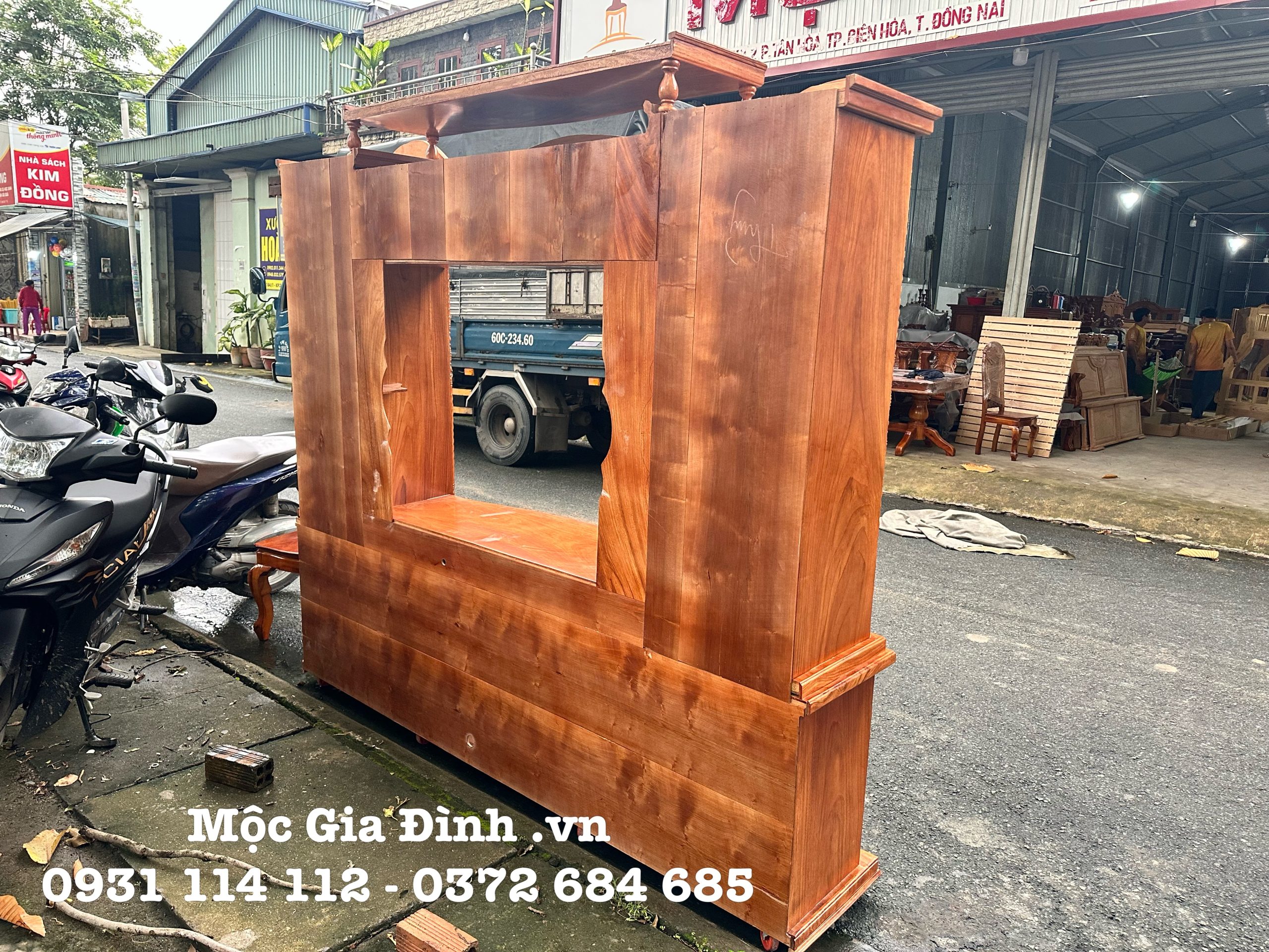 Kệ tivi kèm tủ rượu kiểu Thái được làm bằng gỗ Gõ Đỏ, hậu tủ được làm từ gỗ Bằng Lăng (thao lao), thiết kế có bàn thờ phía trên, Bên cạnh đó, Kệ tivi có thể dùng làm vách ngăn phòng khách.