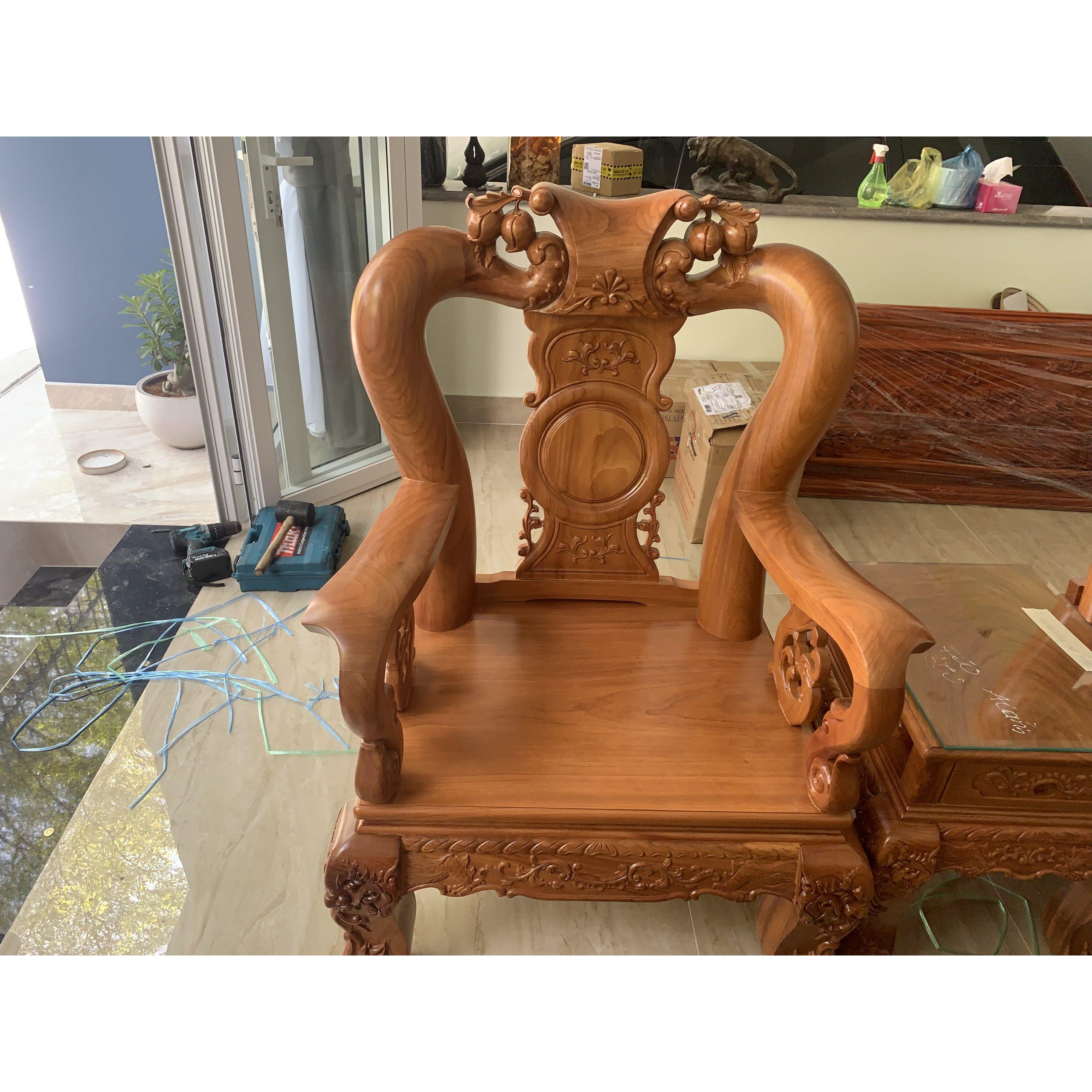 • Bộ Bàn ghế gỗ làm bằng gỗ Gõ Đỏ toàn bộ, đỉnh ghế chạm minh quốc đào 2 mặt trước- sau. Tay ghế cột 12 nguyên khối