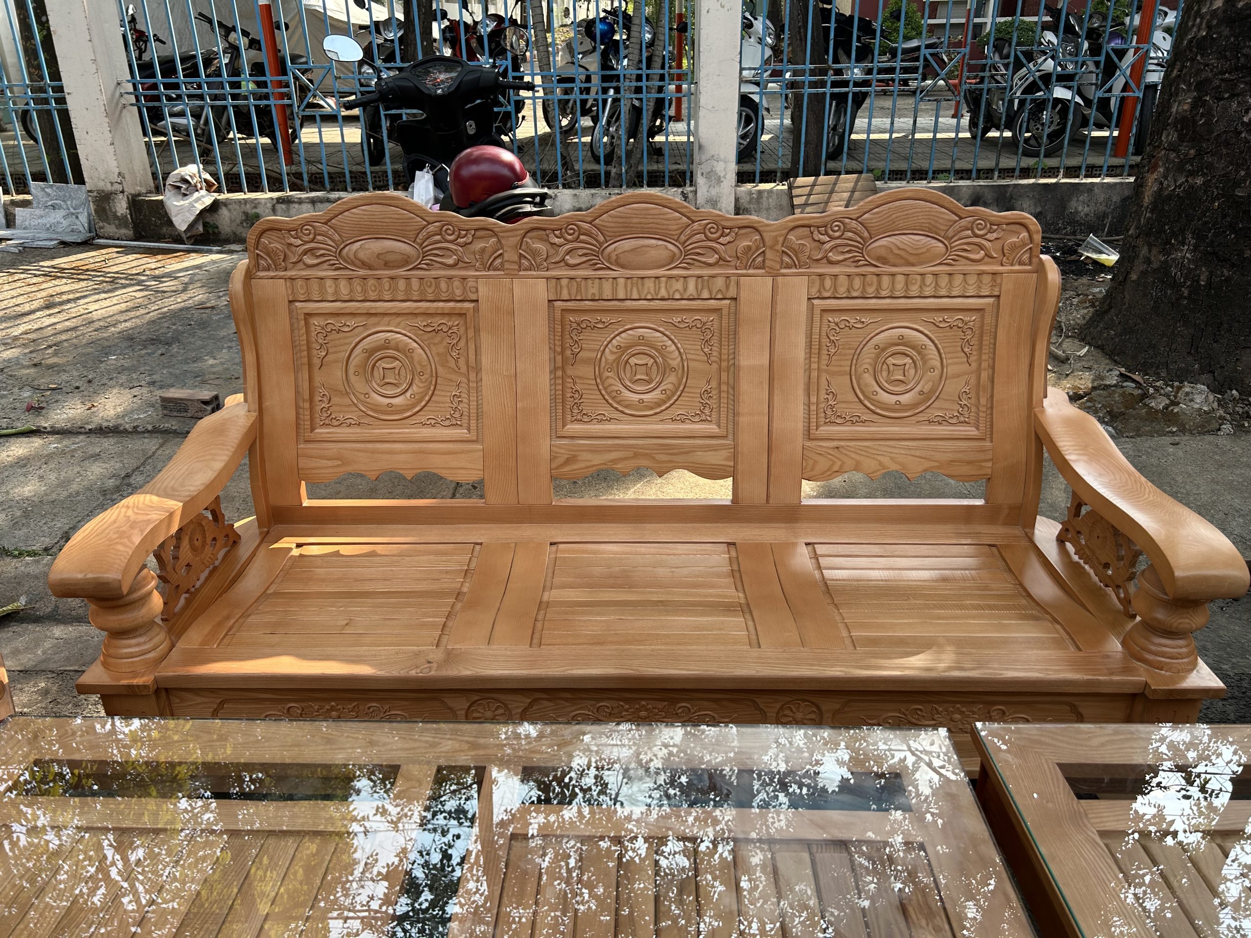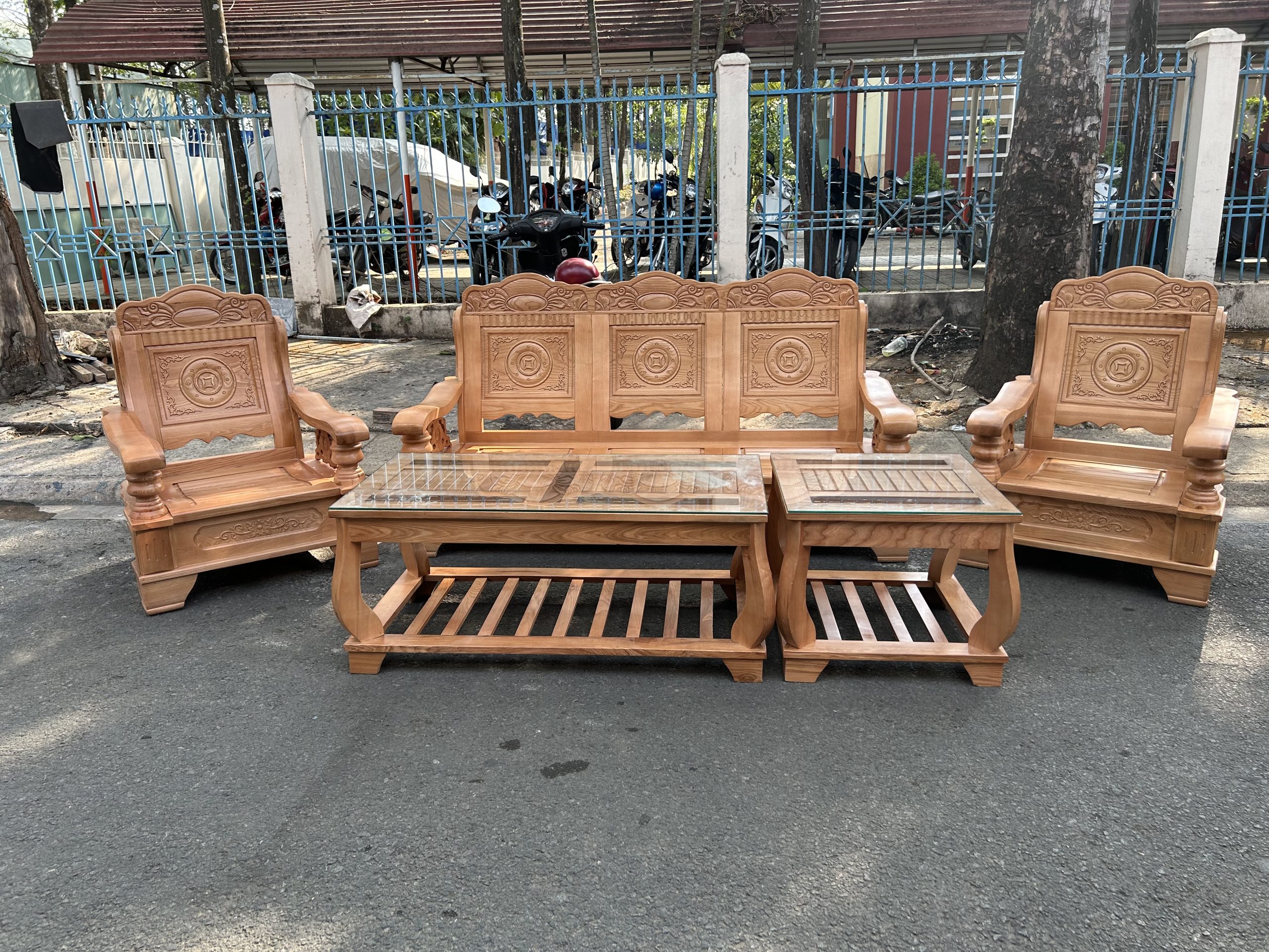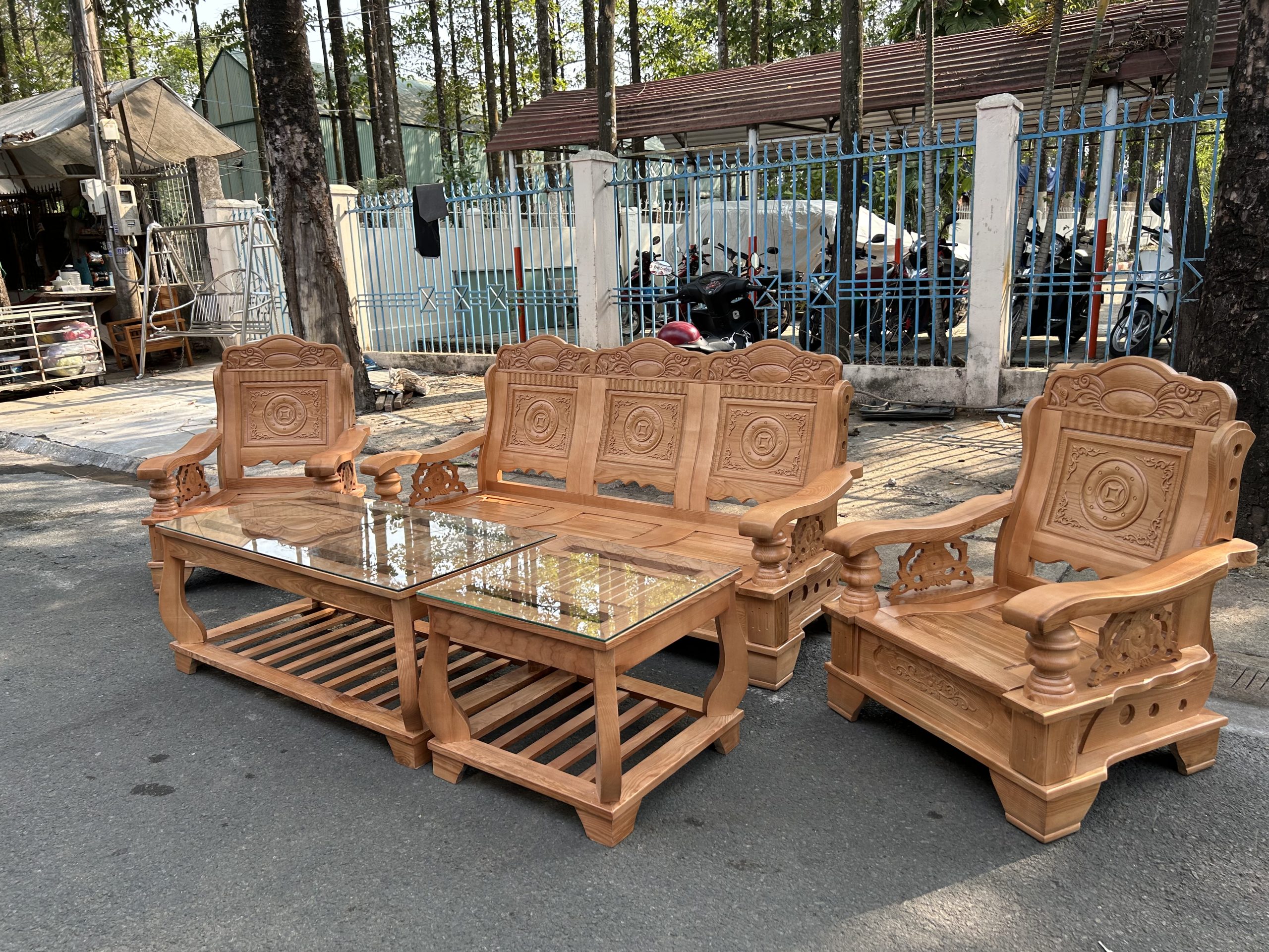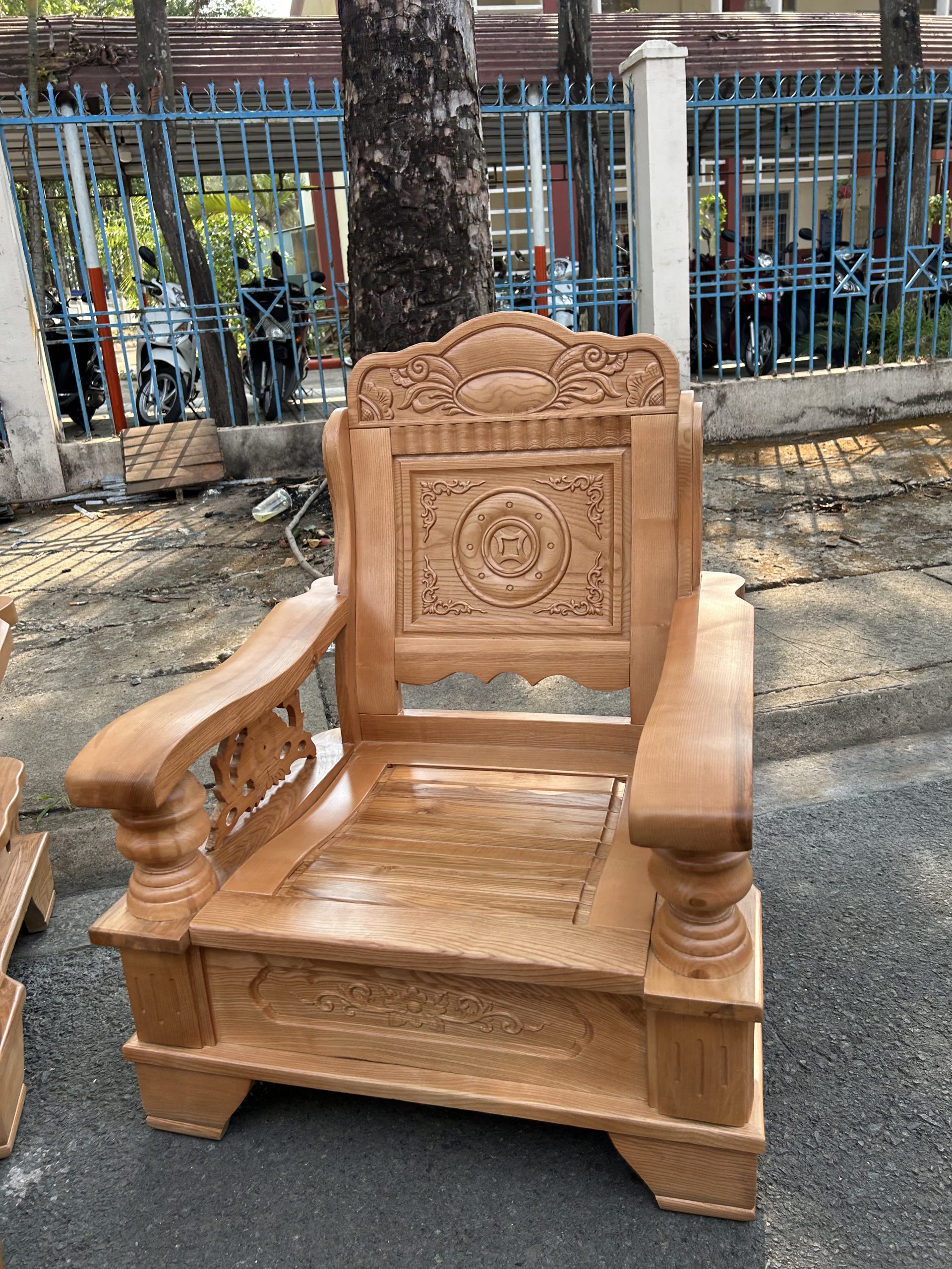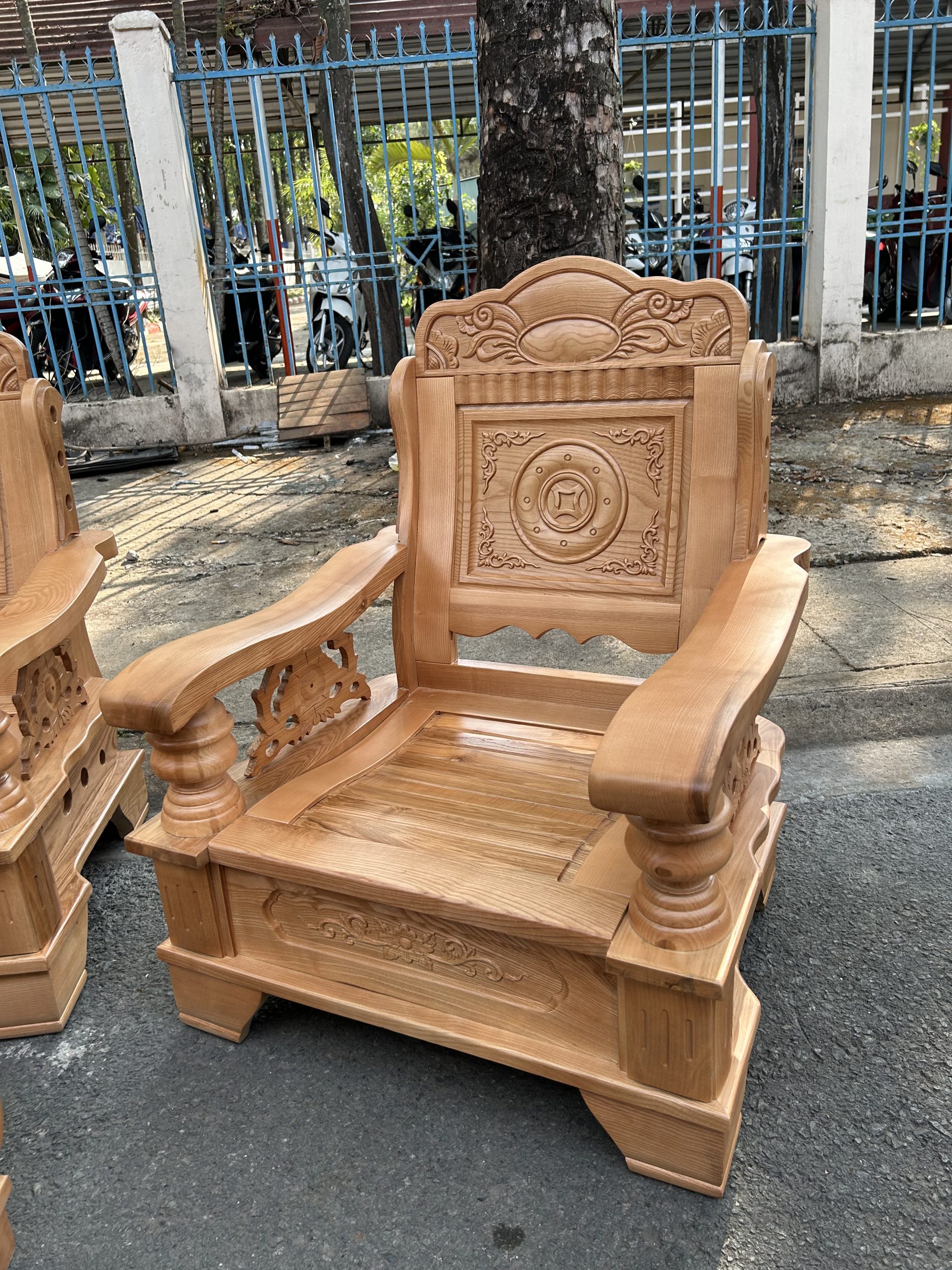 Bộ bàn ghế được làm bằng gỗ sồi Pháp sấy tẩm chống mối mọt. Tựa ghế chạm đồng tiền mang tài lộc đến cho gia chủ. Bộ ghế được thiết kế kiểu hiện đại dành cho các nhà chung cư hoặc các gia đình trẻ.