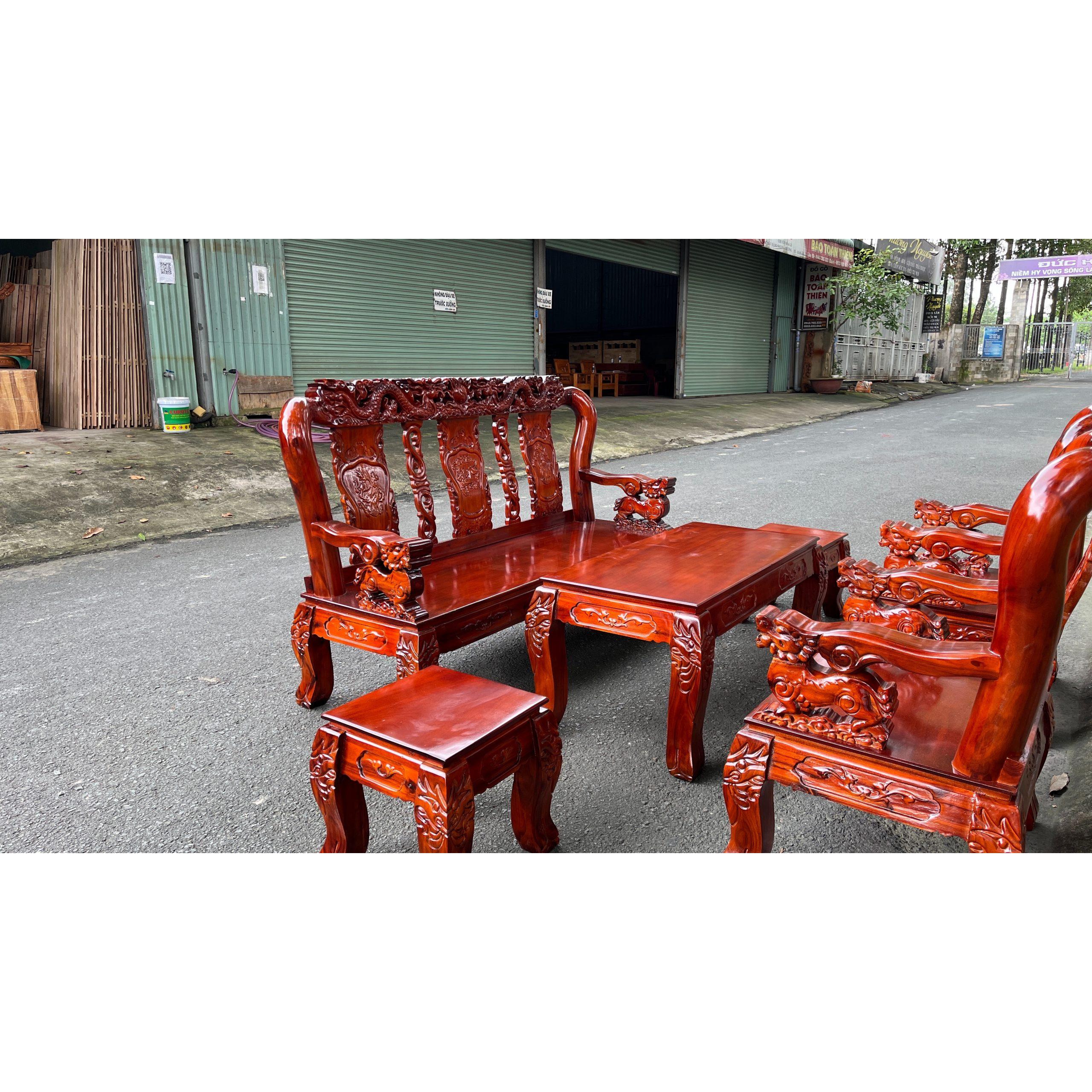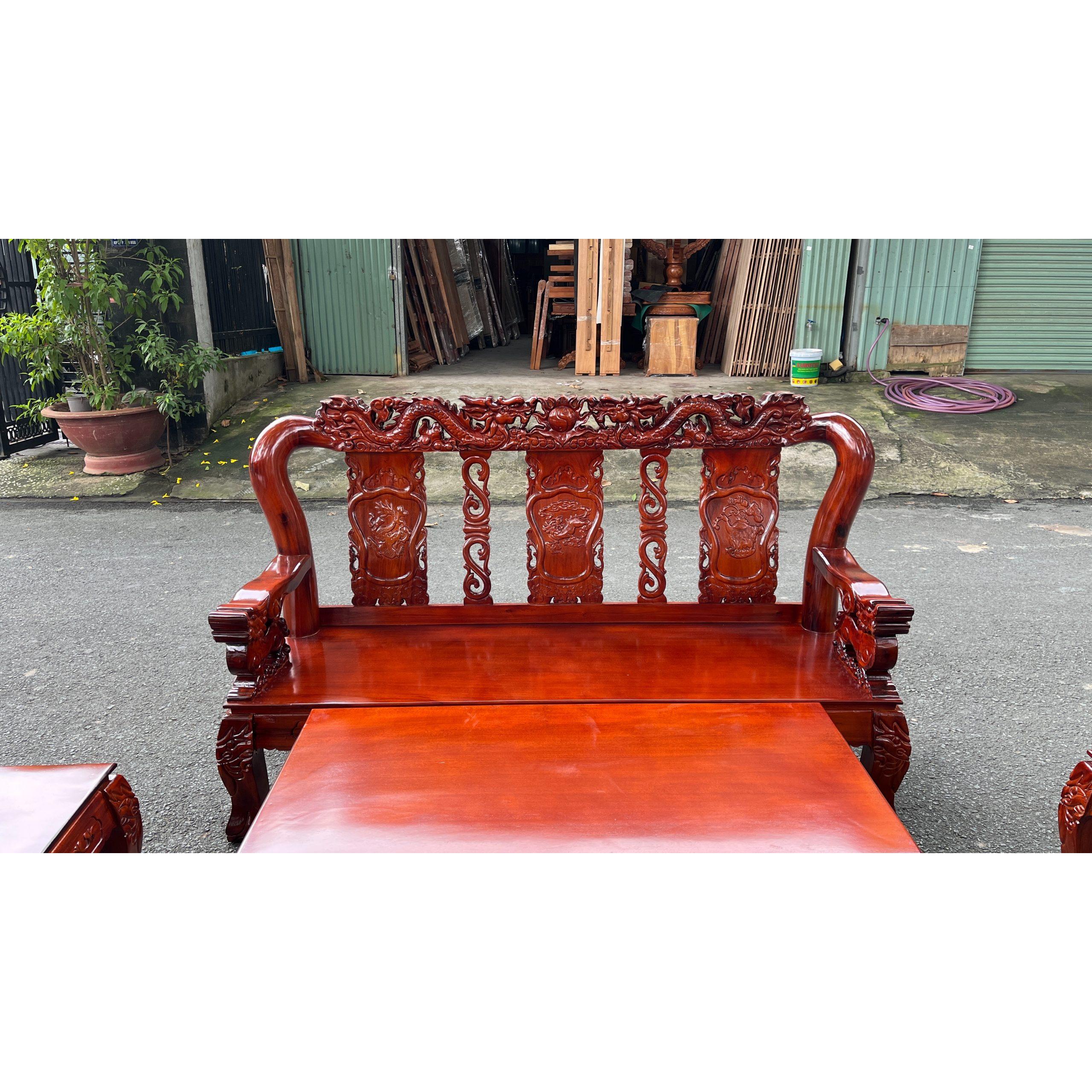 Ghế salon Triện làm từ gỗ Tràm Bông Vàng mặt gỗ Hồng Đào, cột triện tay 10cm, đỉnh ghế chạm song long tranh châu, tựa ghế chạm cnc Tứ Linh: Long- Lân- Quy- Phụng. Gầm tay ghế chạm Lân.