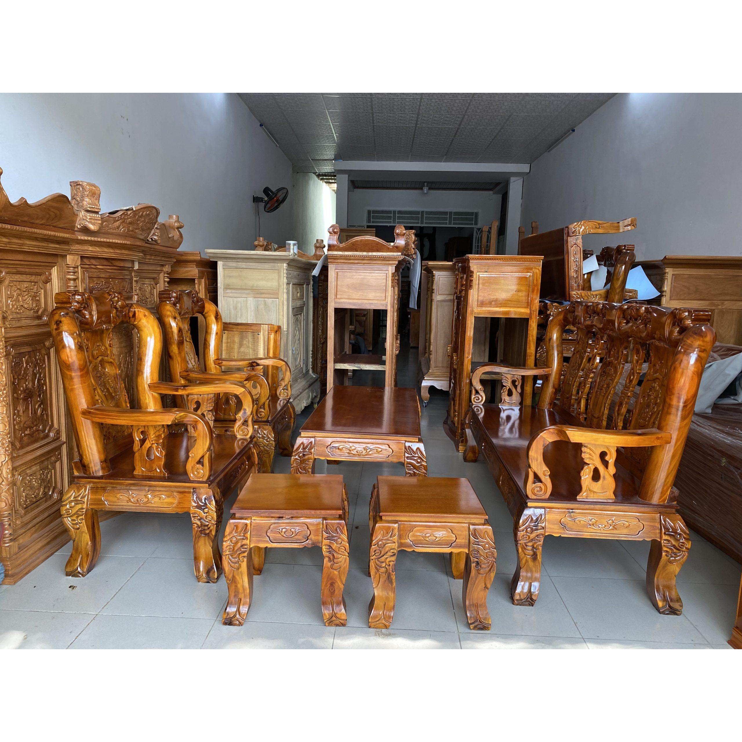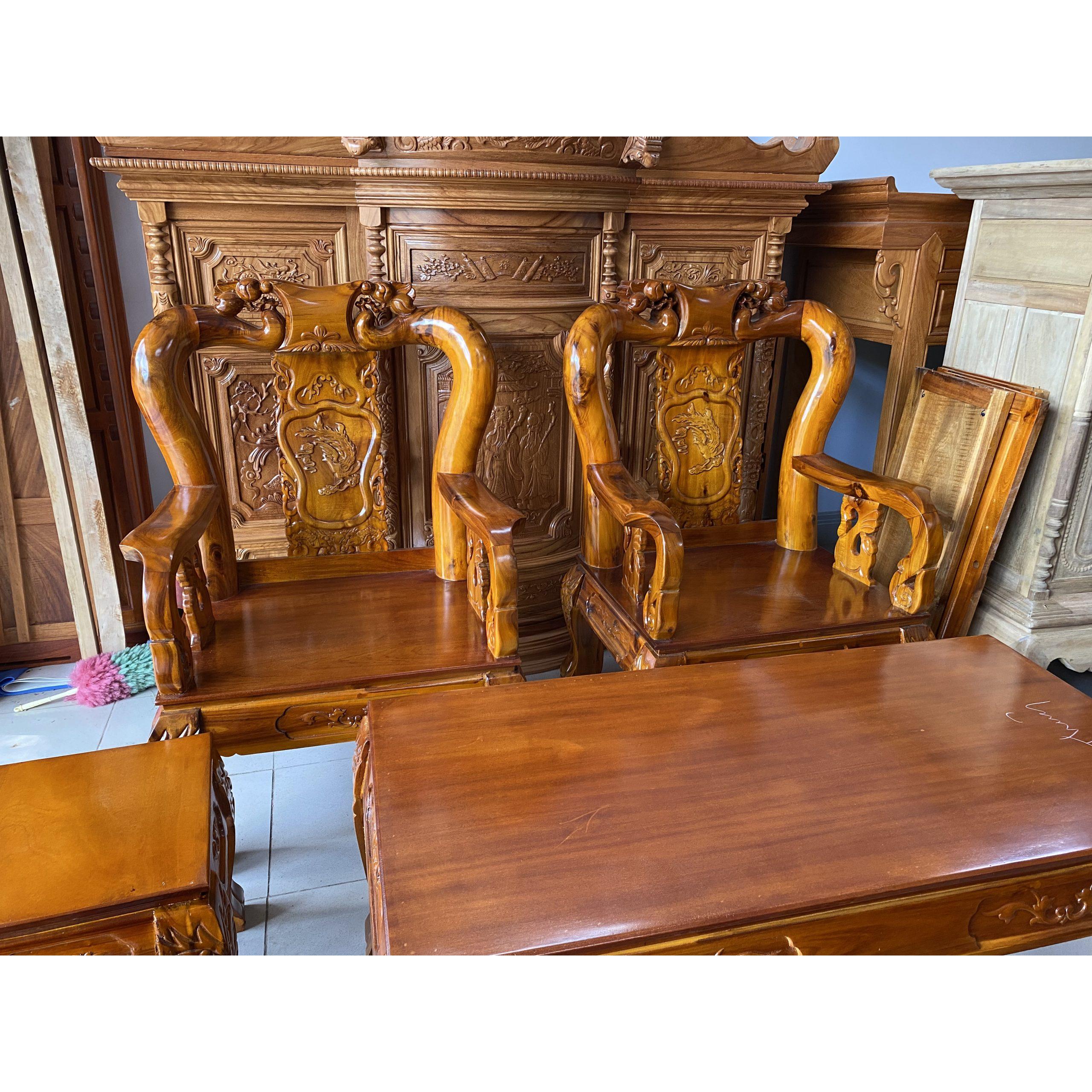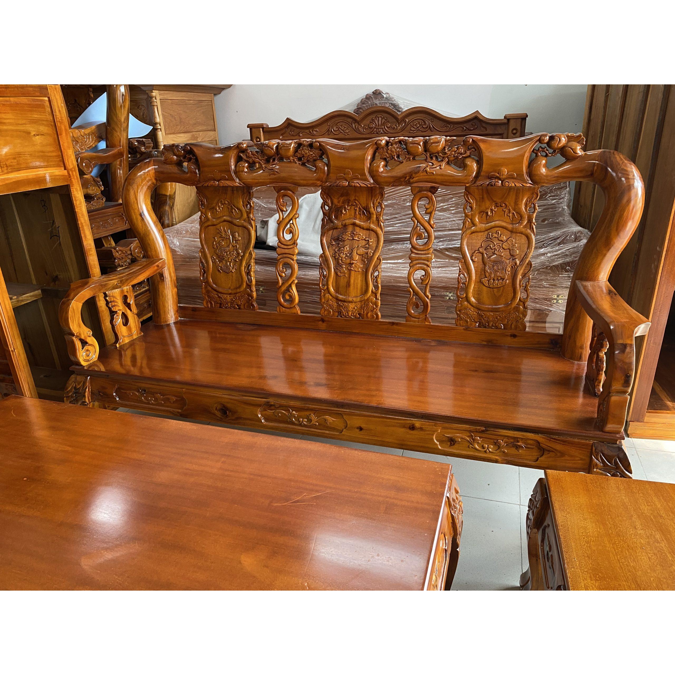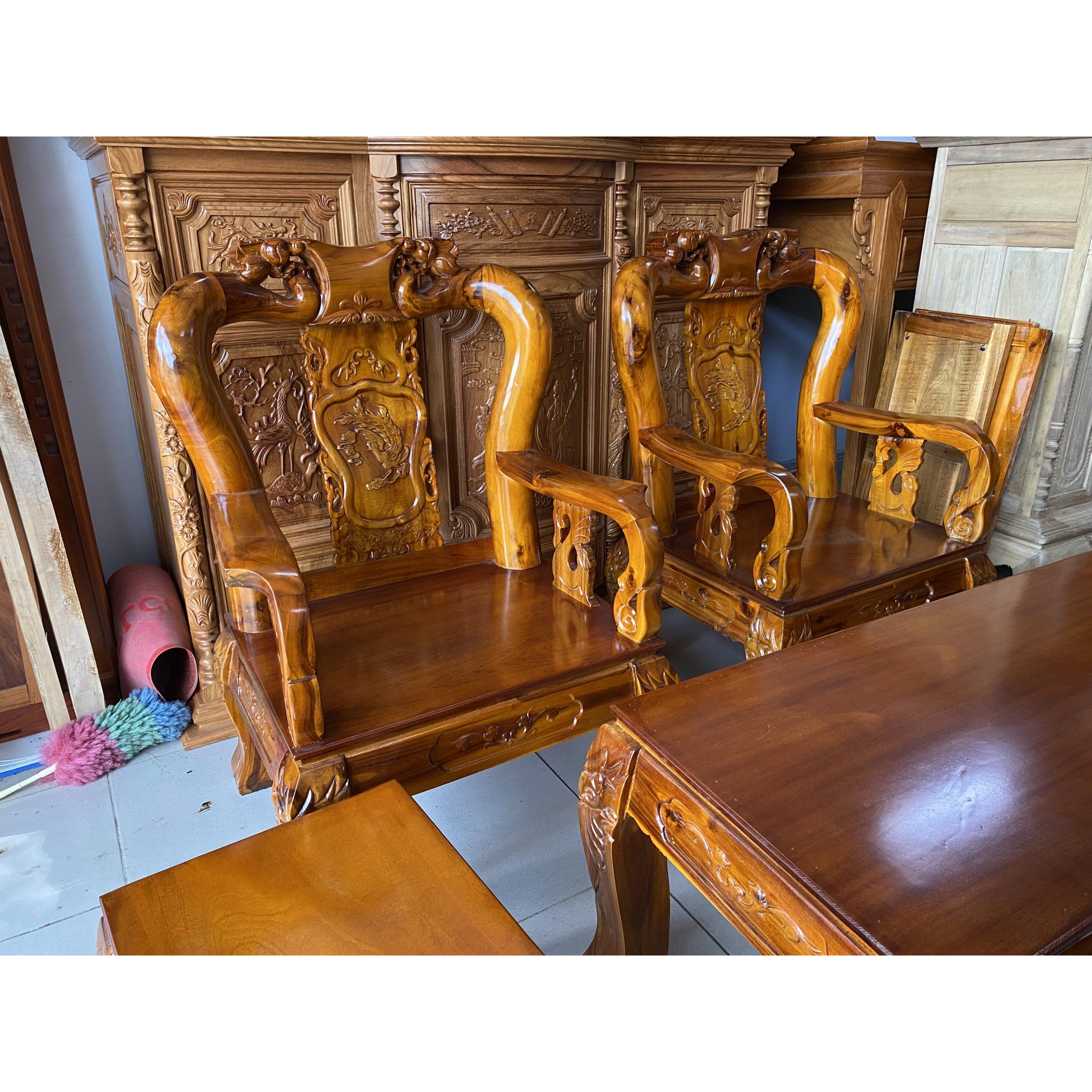 Ghế salon Triện làm từ gỗ Tràm Bông Vàng mặt gỗ Hồng Đào, cột triện tay 10cm, đỉnh ghế chạm lục đào, tựa ghế chạm cnc Tứ Linh: Long- Lân- Quy- Phụng.