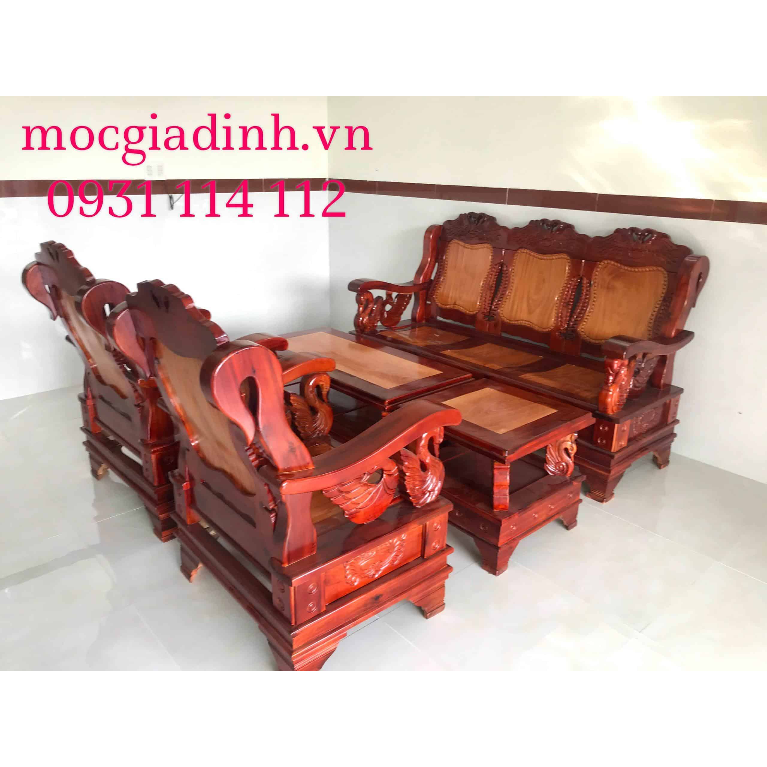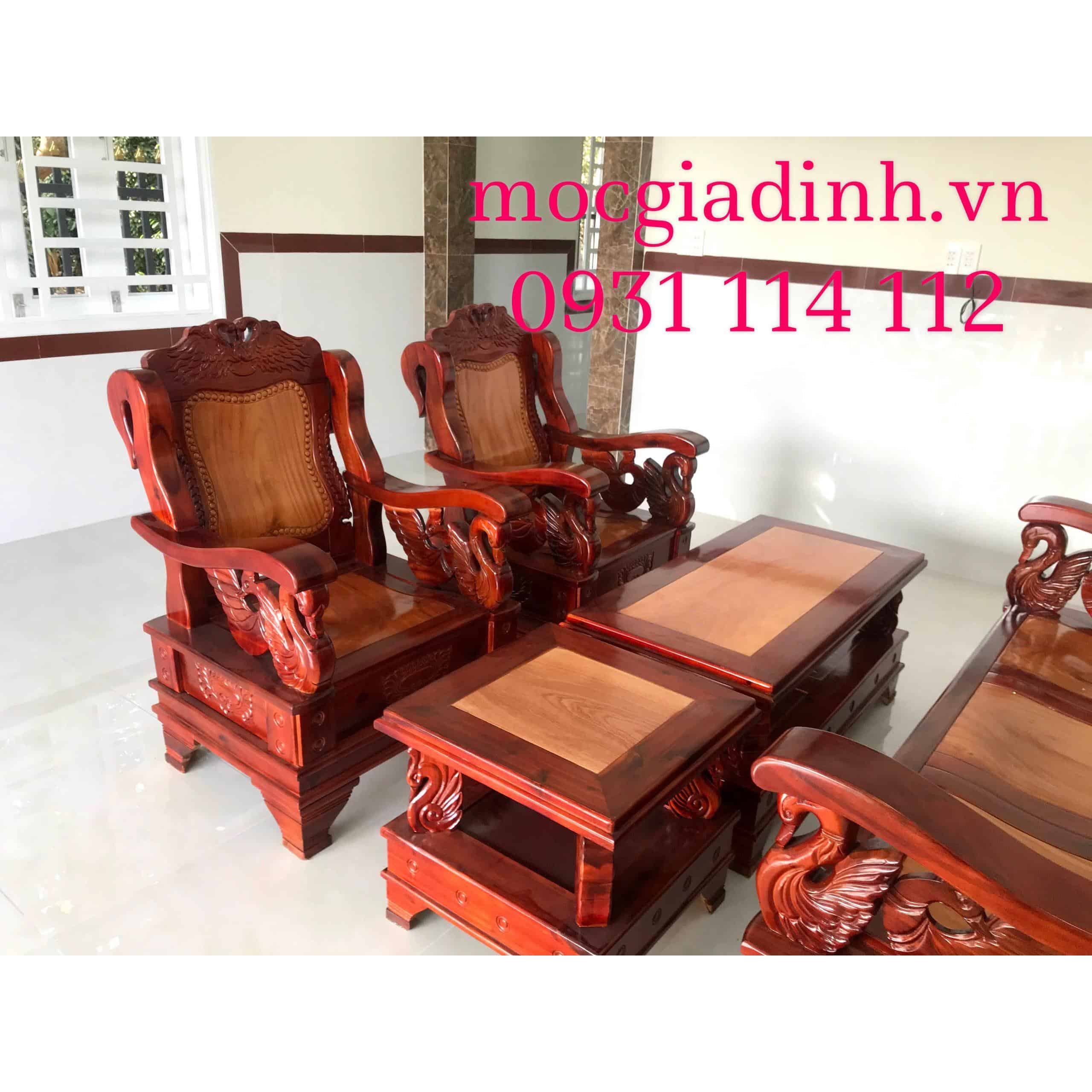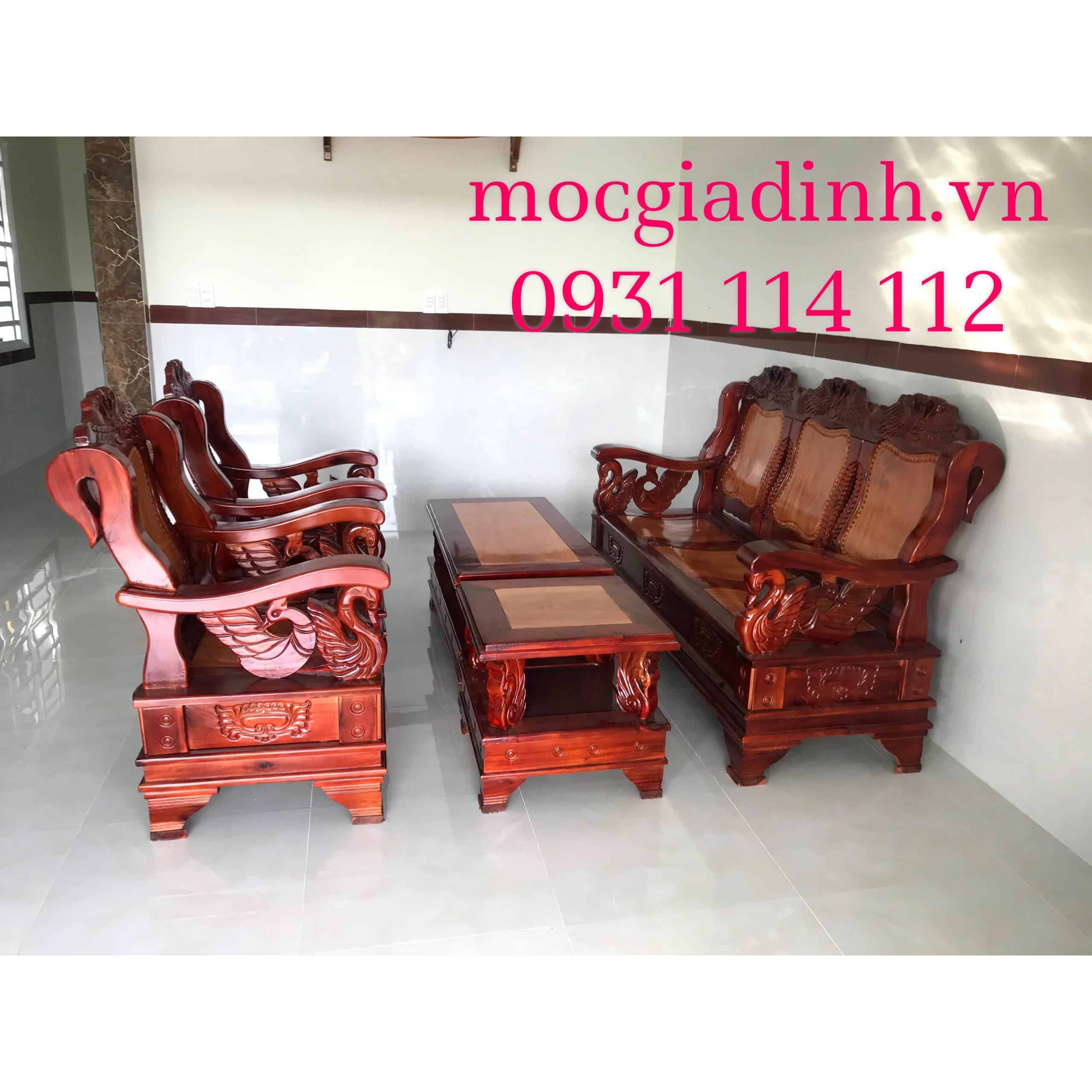 Bộ bàn ghế phòng khách được làm bằng gỗ tràm bông vàng, mặt bàn ghế và tựa lung được làm bằng gỗ hồng đào. Đỉnh ghế chạm thiên nga đôi và dưới tay cũng được gắn thiên nga nguyên con, mong muốn mang về sự trọn vẹn cho gia chủ, ngoài ra còn mang ý nghĩa sung túc, đủ đầy