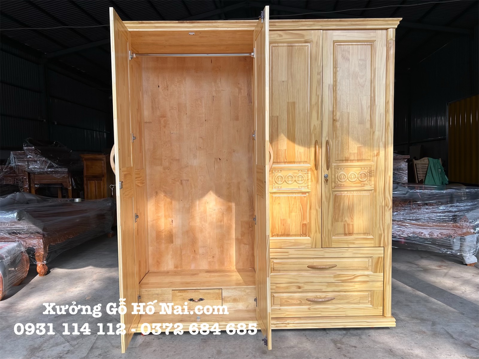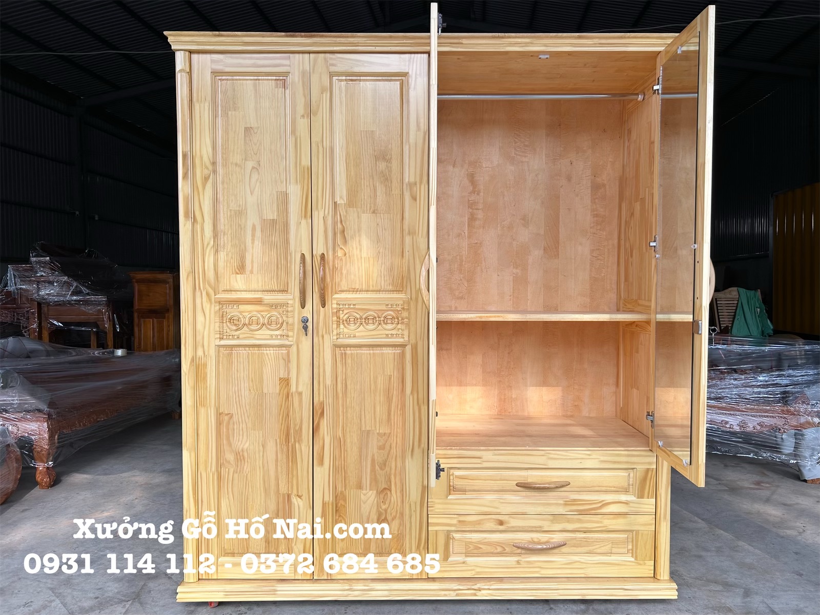 - Tủ quần áo được làm hoàn toàn từ gỗ Thông. Cùng thiết kế cánh tủ trơn chạm hoa văn đơn giản và sang trọng. cùng thiết kế những ngăn tầng và hộc kéo. Tạo thuận tiện trong việc để đồ.